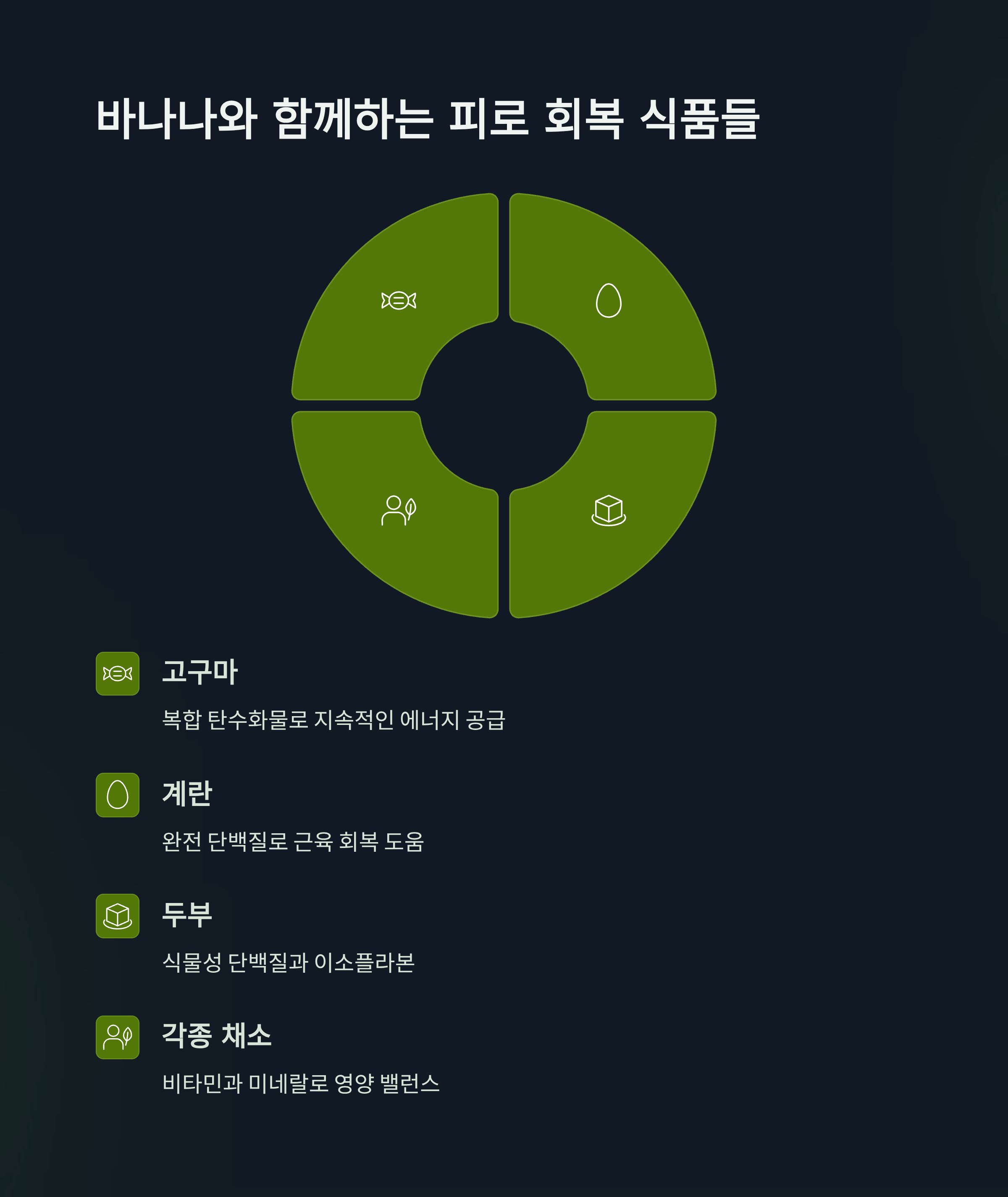 고구마, 계란, 두부, 각종 채소 등도 꾸준히 섭취하면 영양 밸런스 유지에 큰 도움이 돼요.