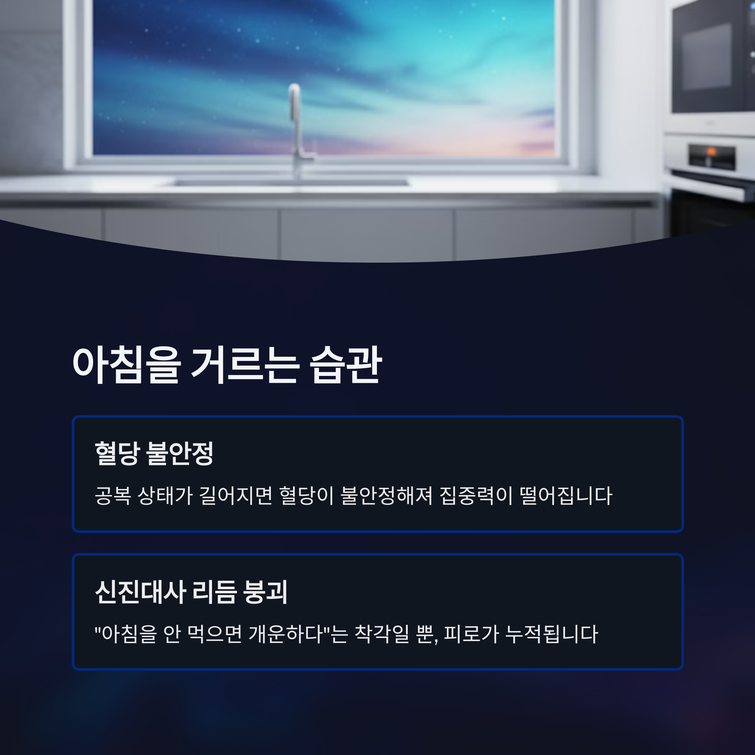 "아침을 안 먹으면 오히려 개운하다"는 말은 일시적 착각일 뿐, 실제로는 신진대사 리듬이 무너져 피로 누적을 부릅니다.