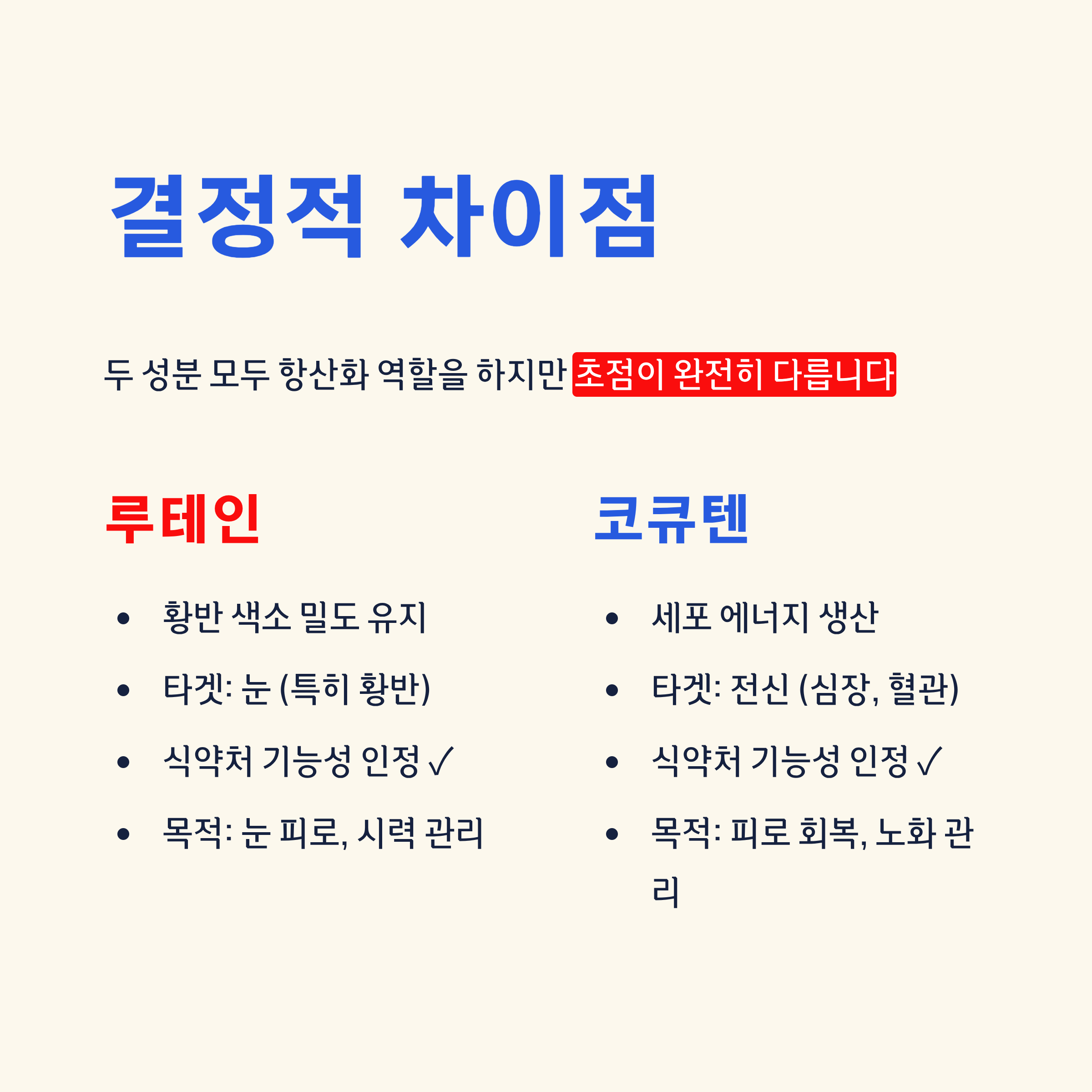 | 주요 기능 | 황반 색소 밀도 유지 | 세포 에너지 생산 및 항산화 |