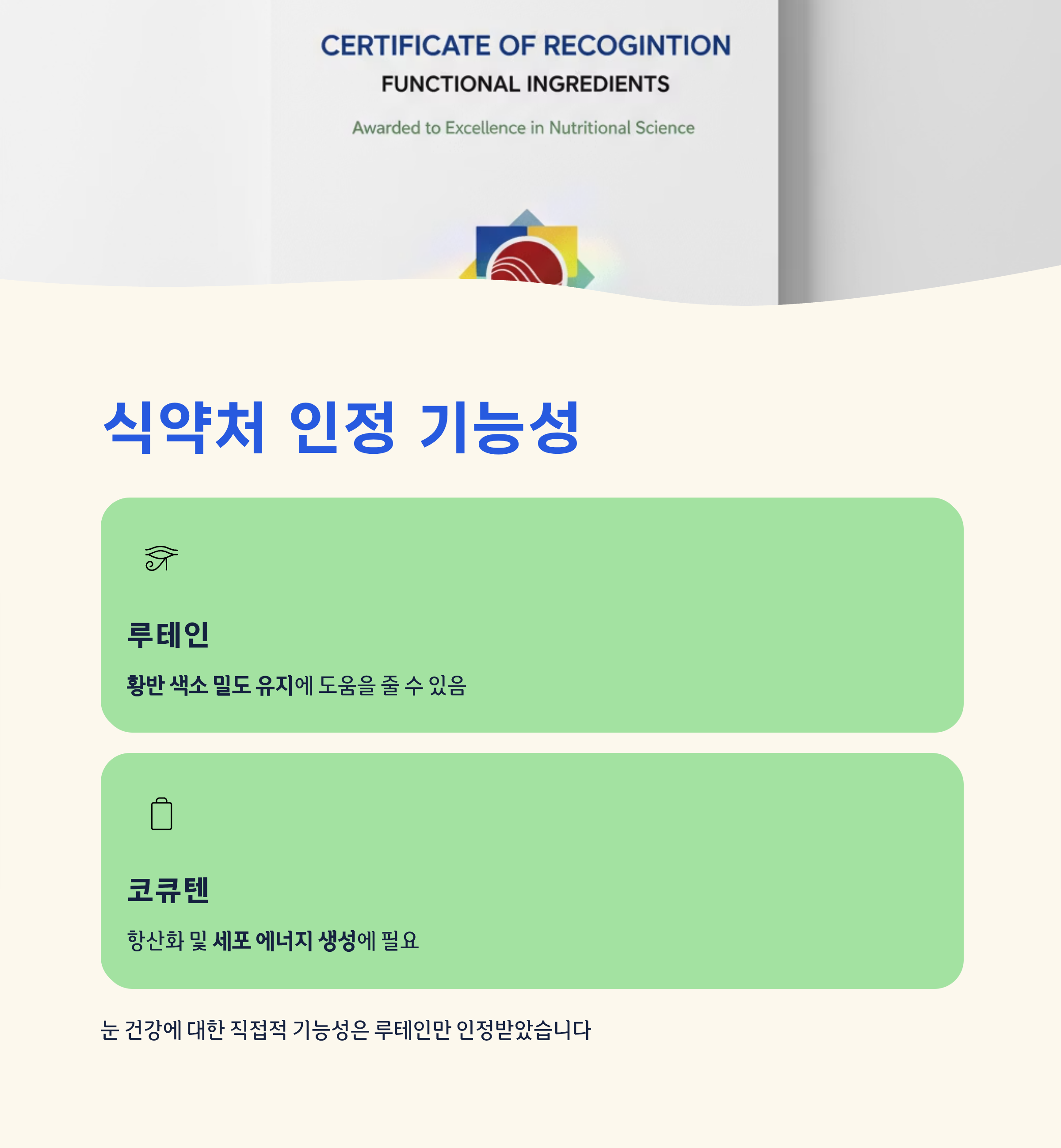 눈 건강에 대해 직접적인 기능성 인정은 루테인이 받은 점이 분명한 차이입니다.