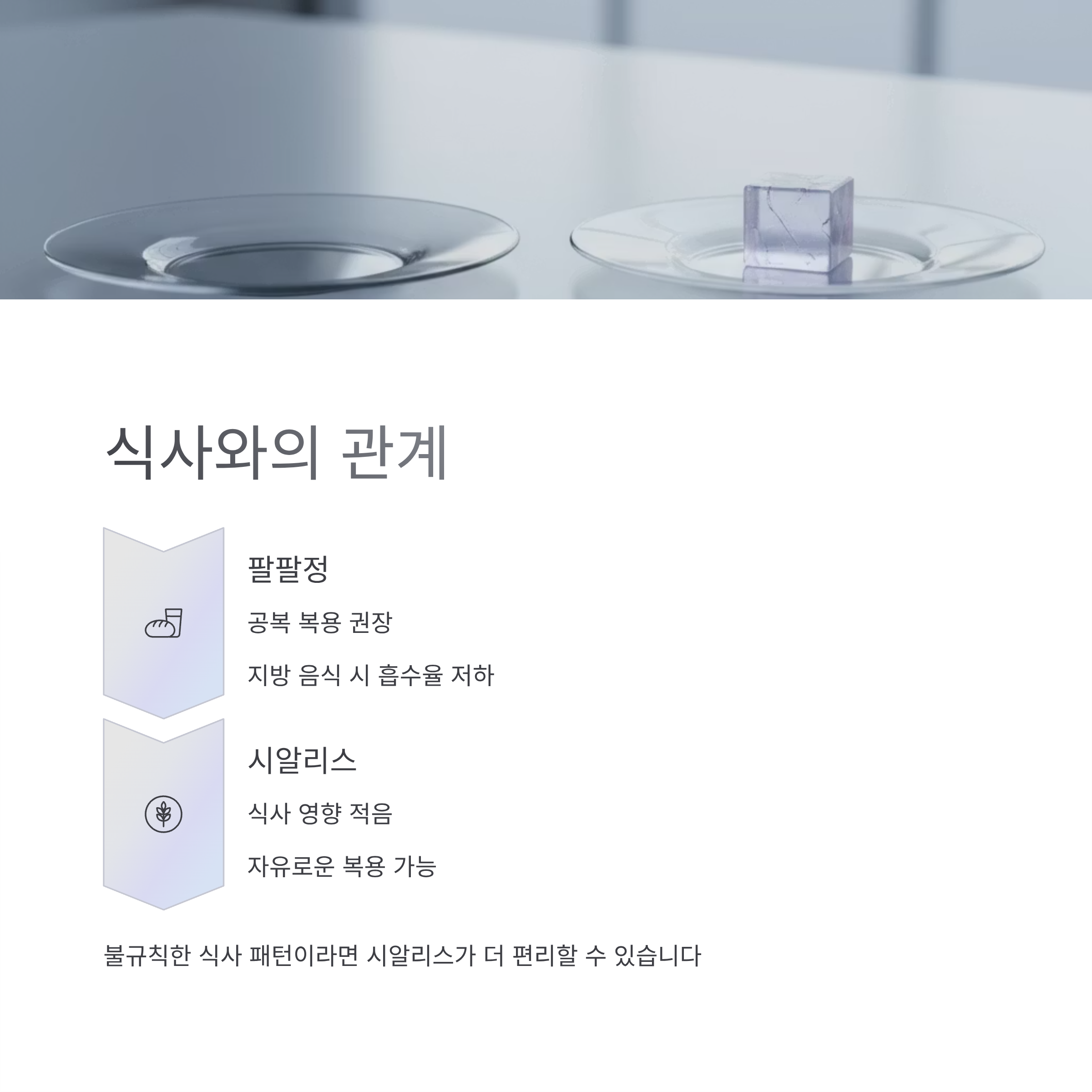 이 차이는 외식이 잦거나 불규칙한 식사 패턴을 가진 사람에게 시알리스가 조금 더 유리한 이유가 되기도 합니다.