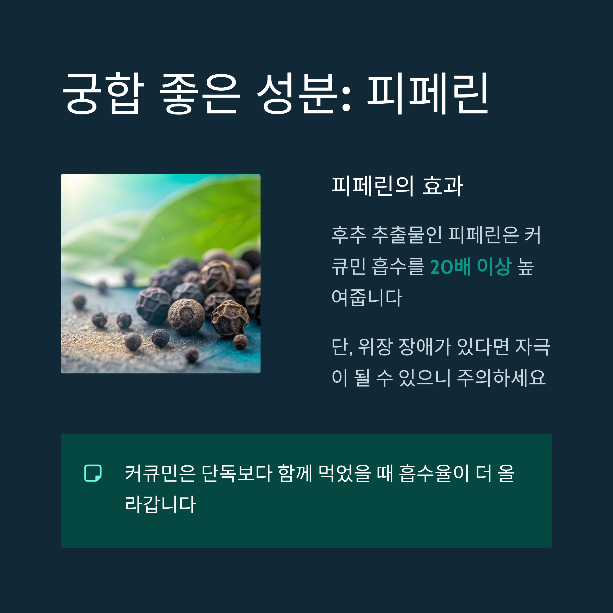 대표적으로 '피페린(후추 추출물)'이 있는데요, 커큐민의 흡수를 20배 이상 높여준다는 연구도 있습니다.
