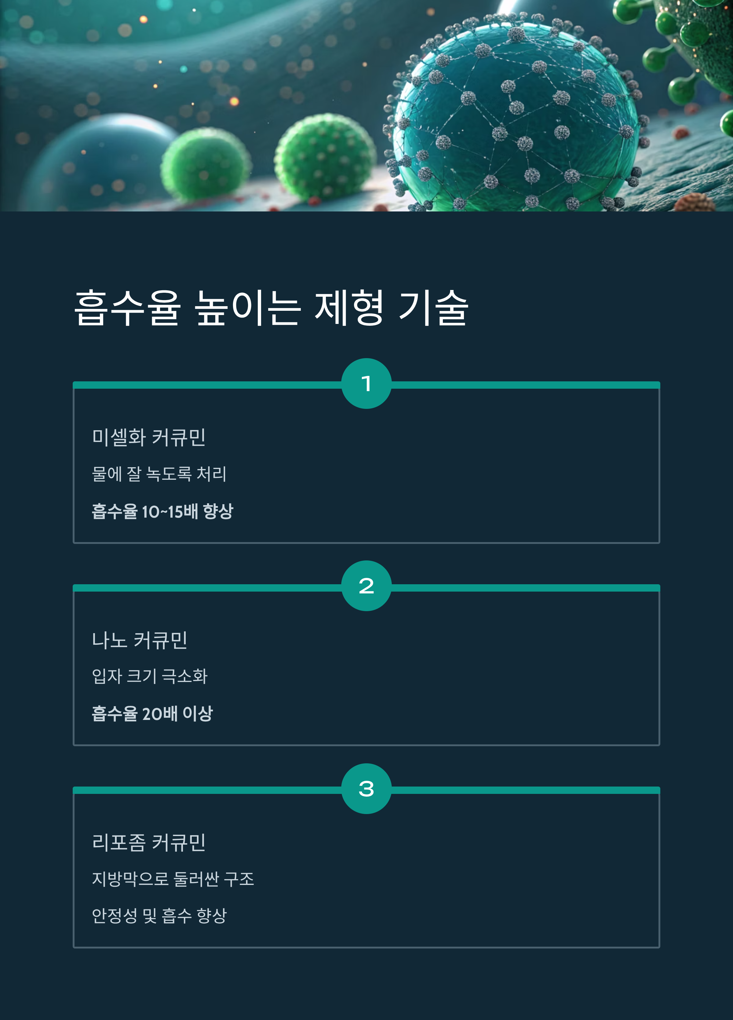 | 리포좀 커큐민 | 지방막으로 둘러싼 구조 | 안정성 및 흡수 ↑ |