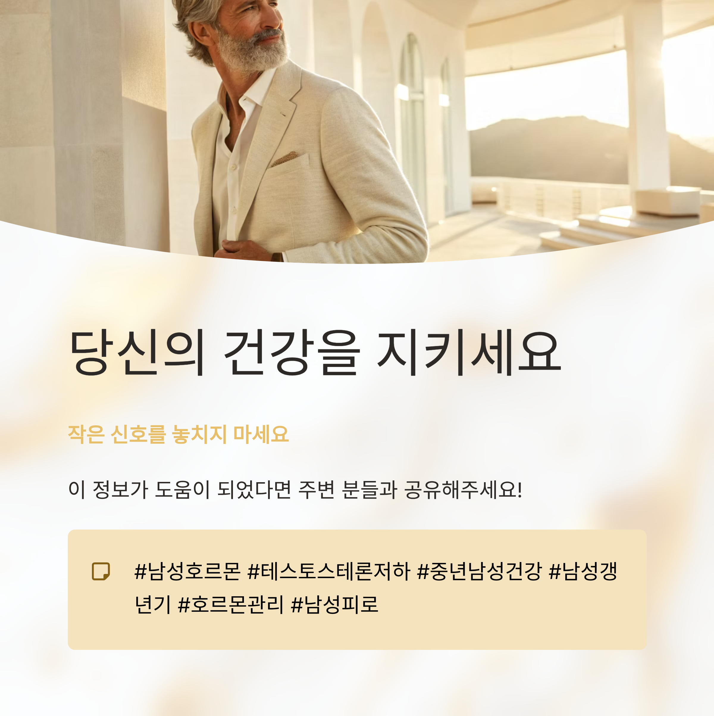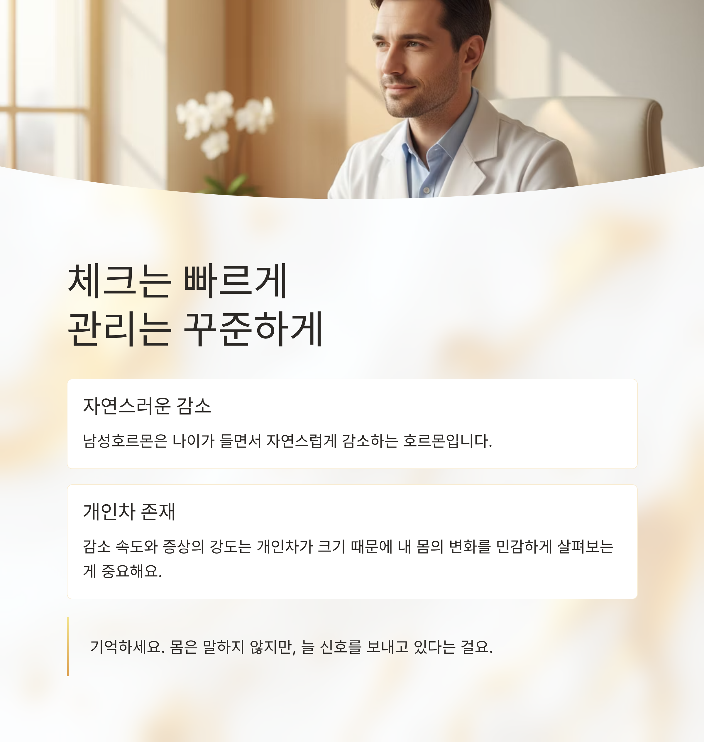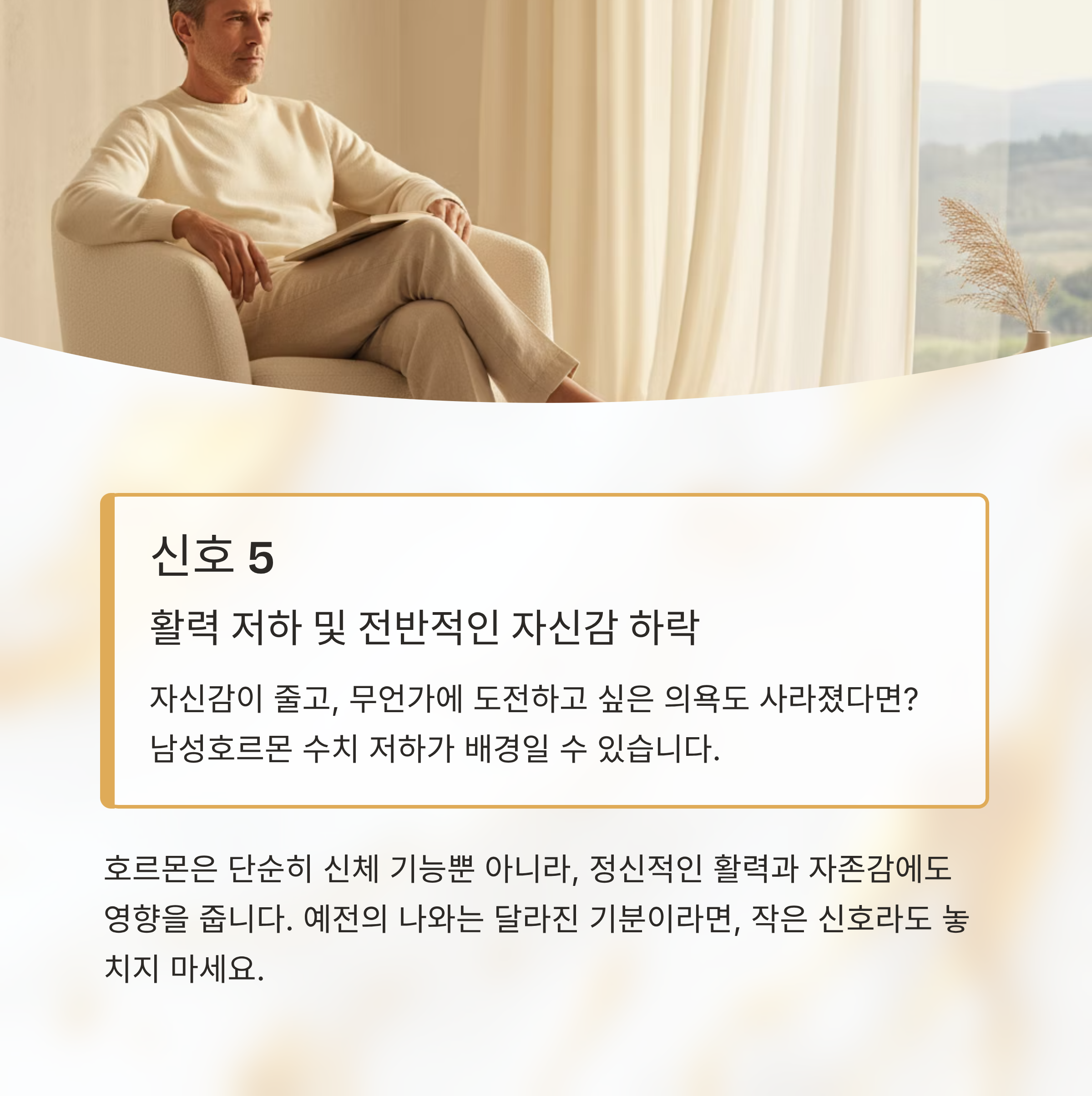 나도 모르게 피곤함이 몰려오고, 예전보다 활력이 줄었다는 느낌이 든다면, 남성호르몬 수치에 변화가 생긴 건 아닌지 의심해볼 필요가 있습니다. 특히 중년 이후 남성이라면 이런 변화가 더 뚜렷하게 나타날 수 있어요. 오늘은 일상 속에서 남성호르몬 보충이 필요하다는 신호 다섯 가지를 짚어보며, 내 몸 상태를 점검하는 시간을 가져보겠습니다.