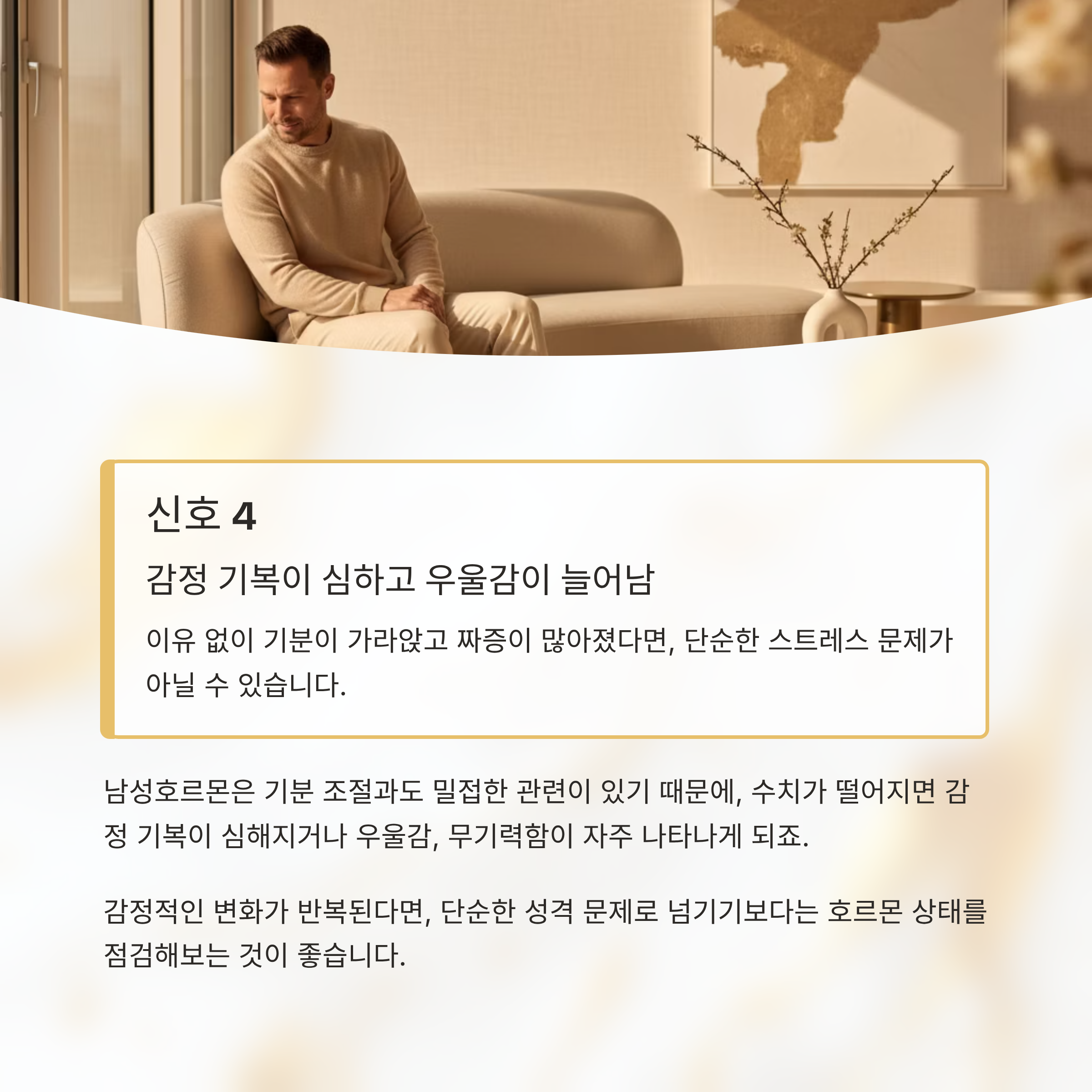 남성호르몬은 기분 조절과도 밀접한 관련이 있기 때문에, 수치가 떨어지면 감정 기복이 심해지거나