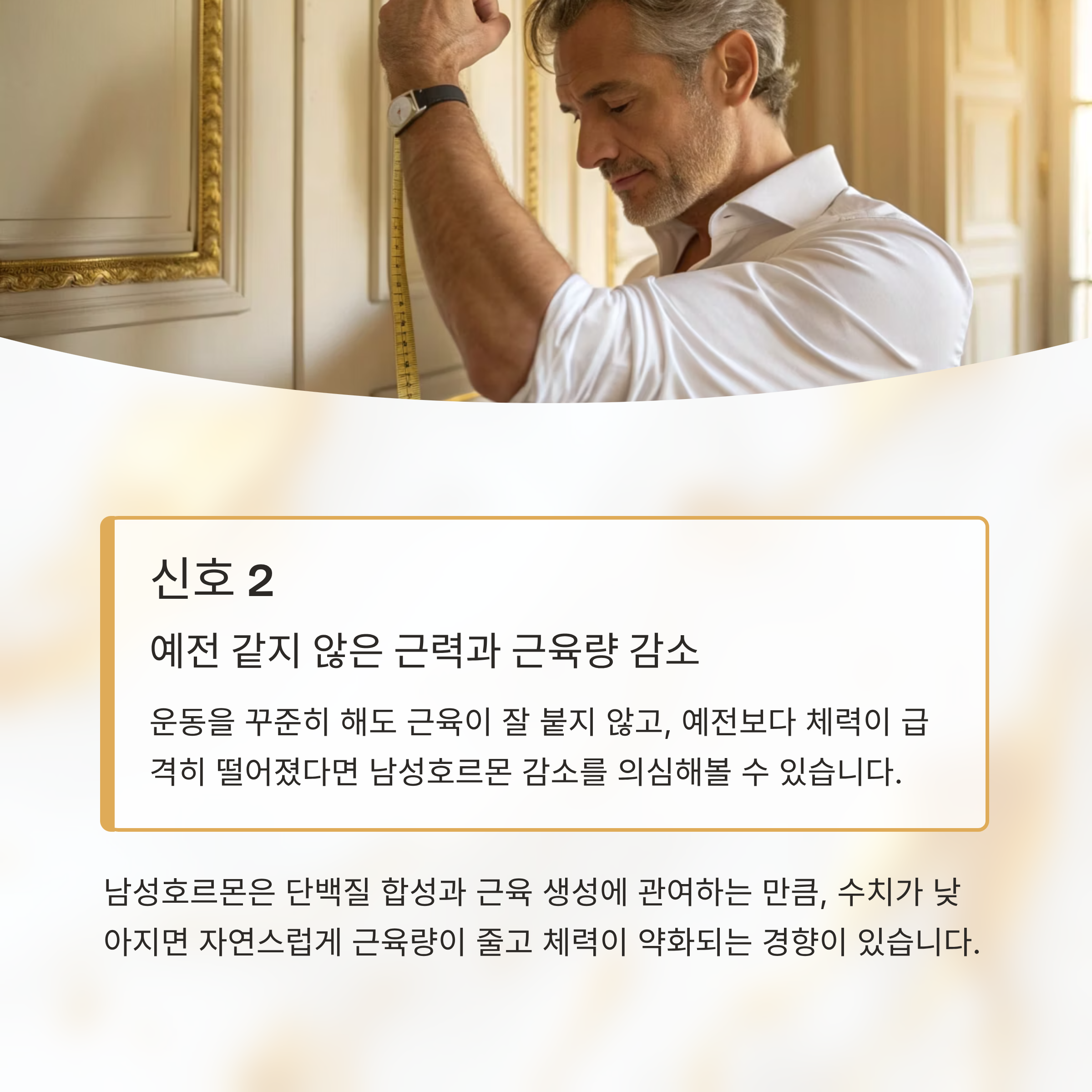 수치가 낮아지면 자연스럽게 근육량이 줄고 체력이 약화되는 경향이 있습니다.