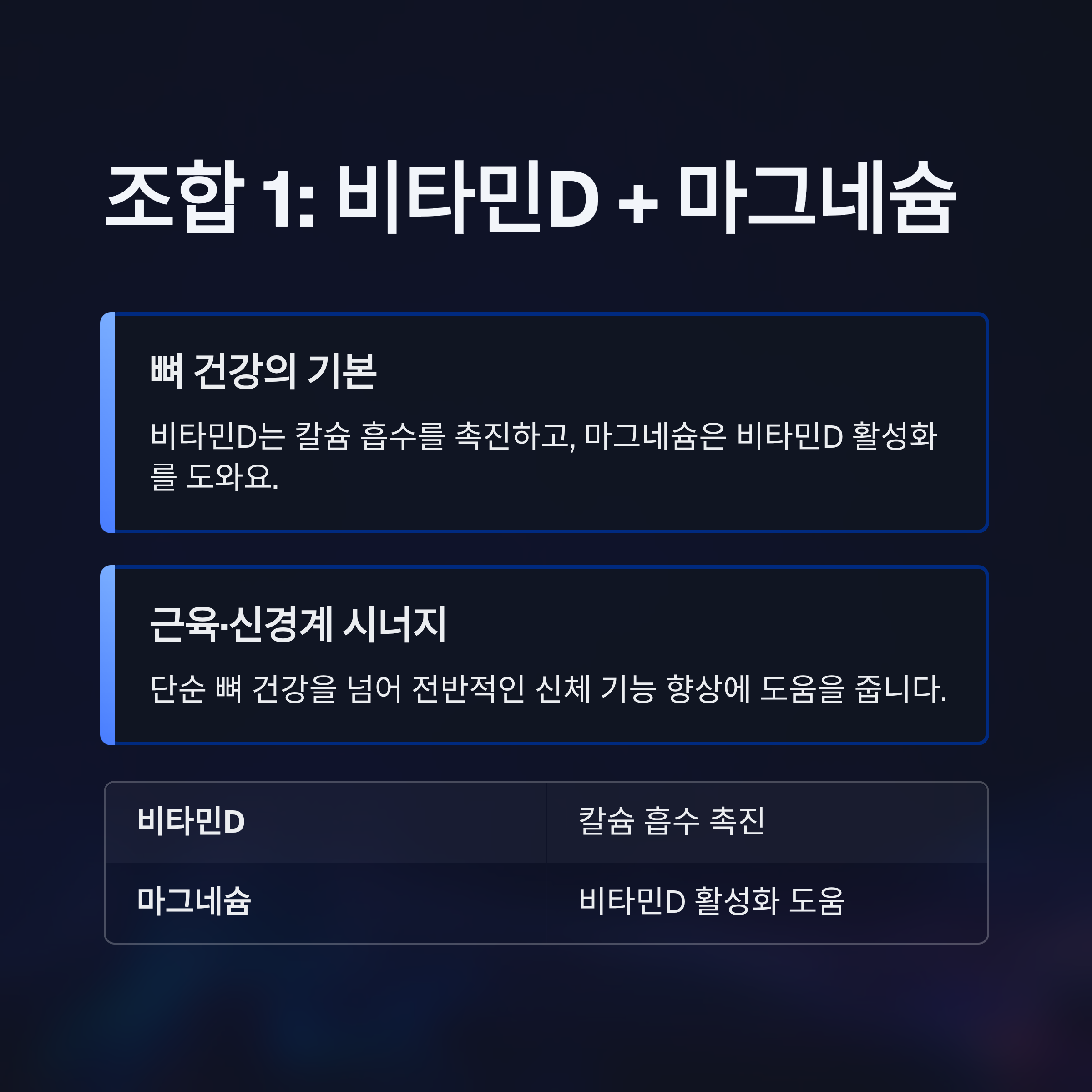 단순히 뼈 건강뿐 아니라, 근육과 신경계 기능에도 유의미한 시너지 효과가 기대됩니다.