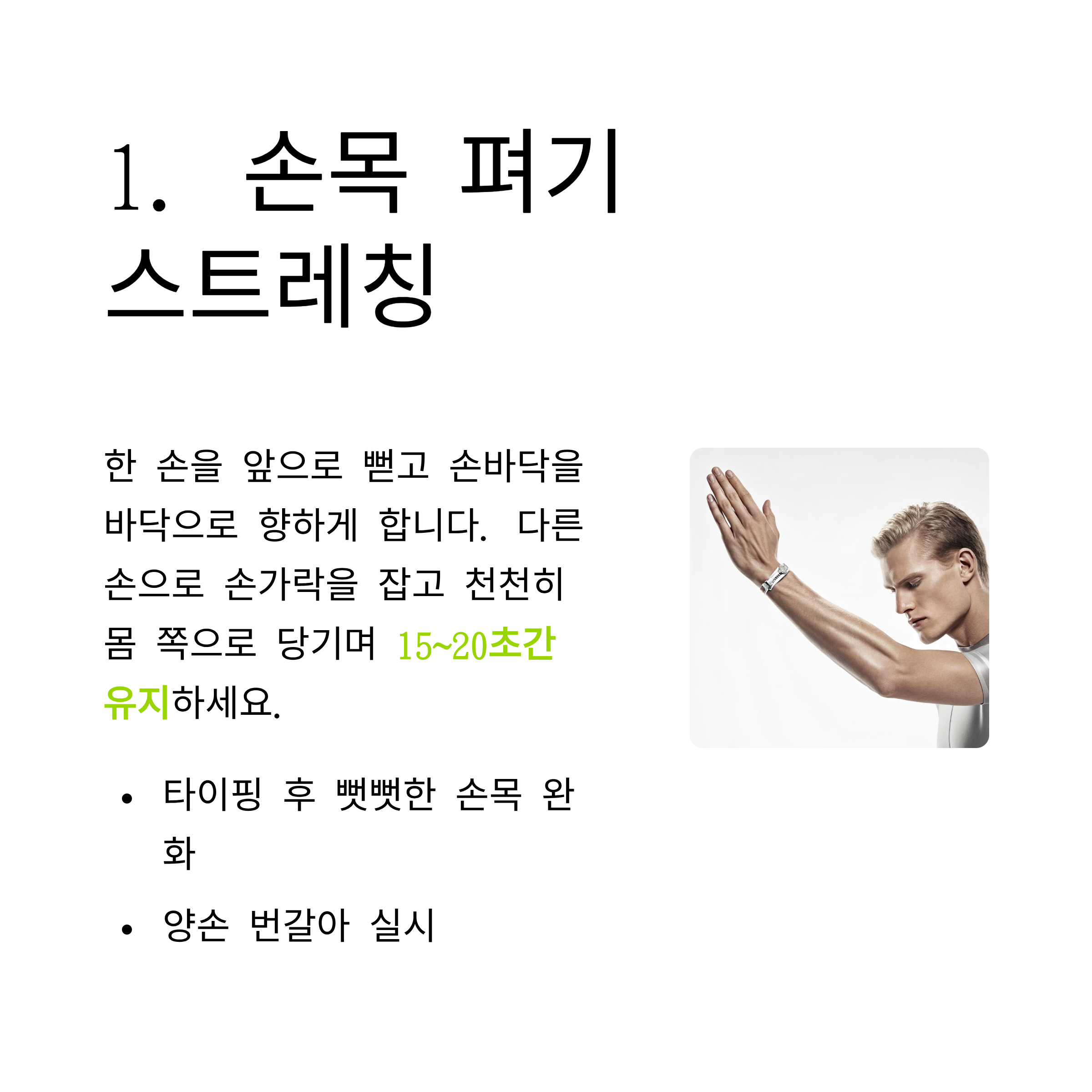 | 손목 펴기 스트레칭 | 오전/작업 전 | 15~20초씩 2회 |