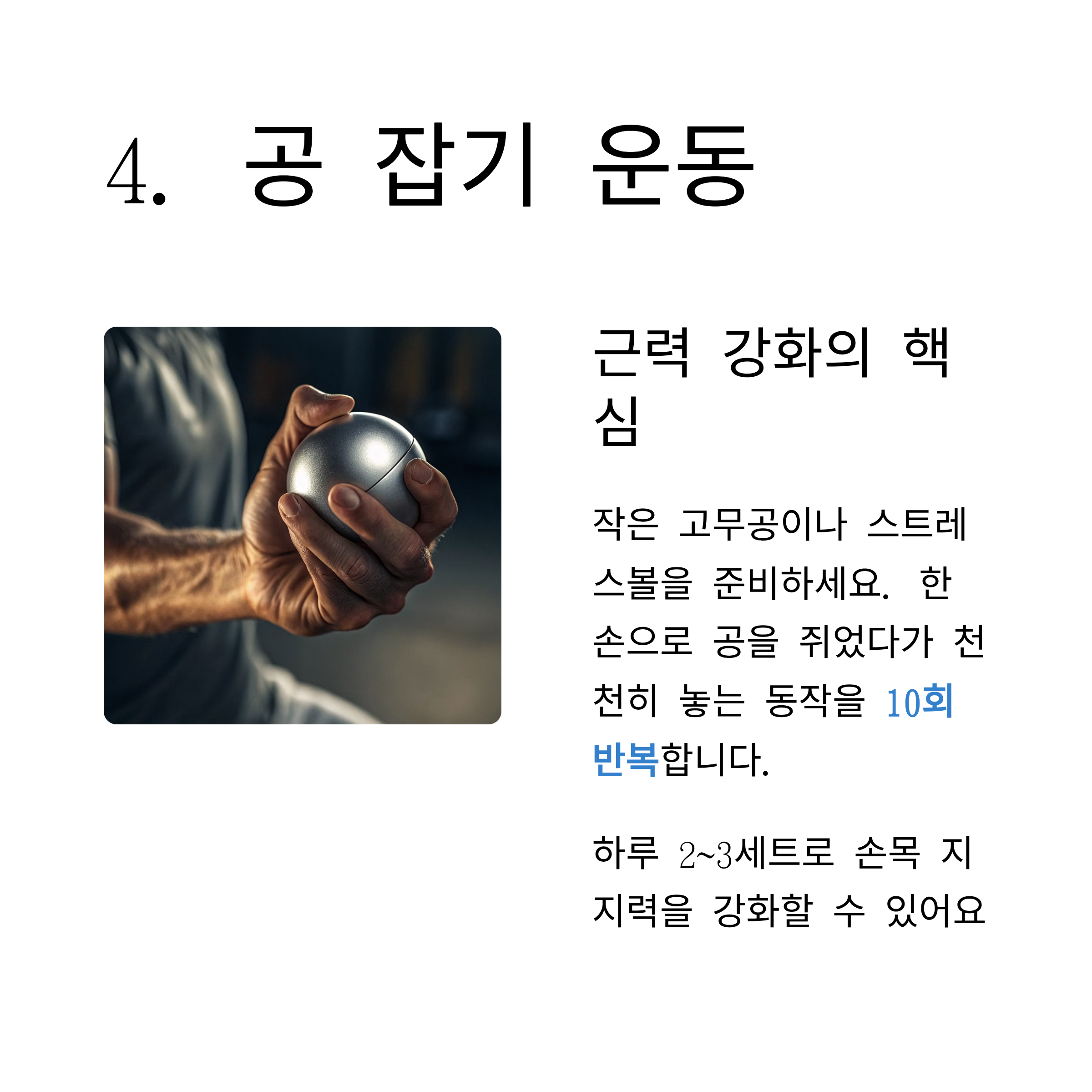 한 손으로 공을 쥐었다가 천천히 놓는 동작을 10회 반복합니다.