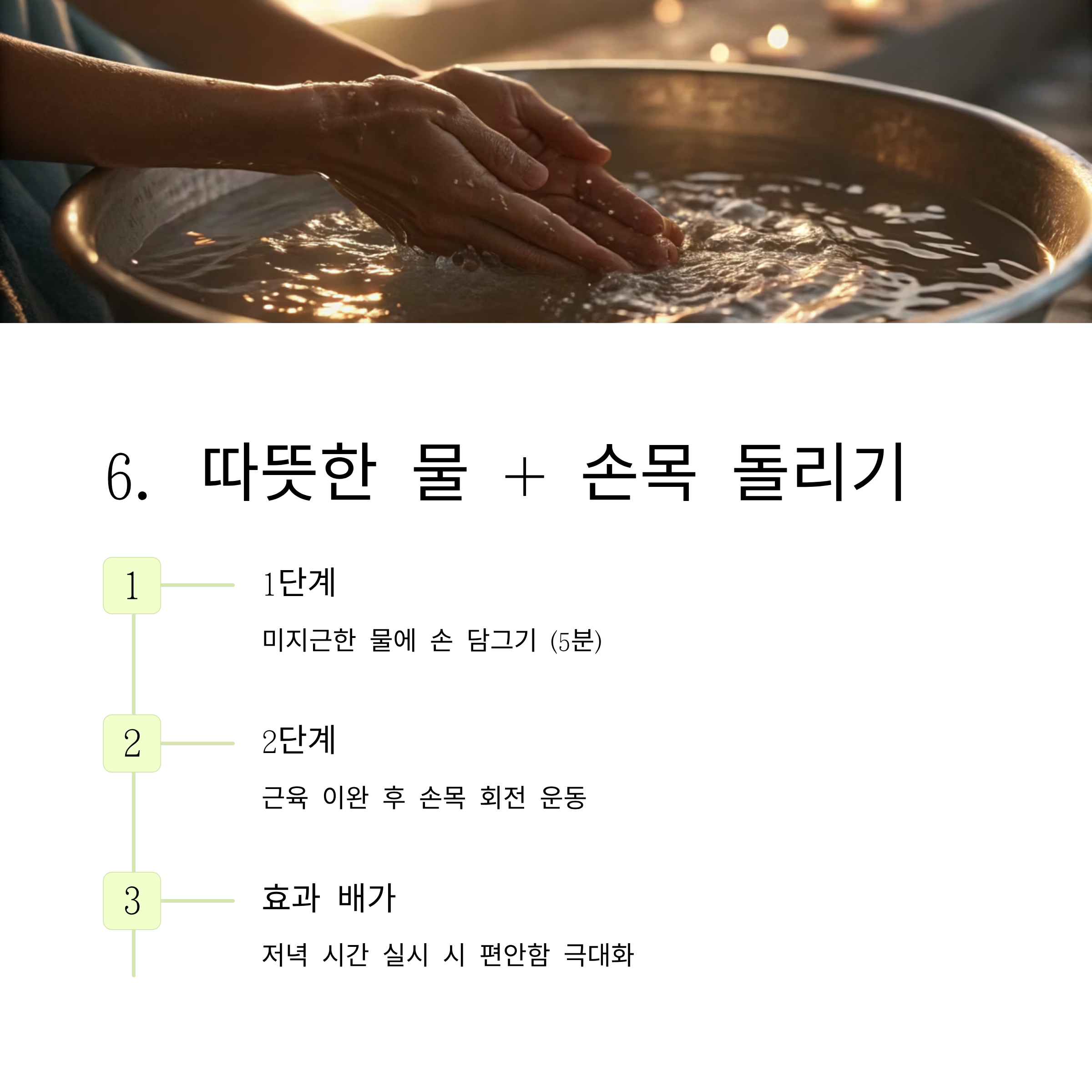 | 물 담그기+회전 운동 | 저녁/수면 전 | 5분+회전 10회 |