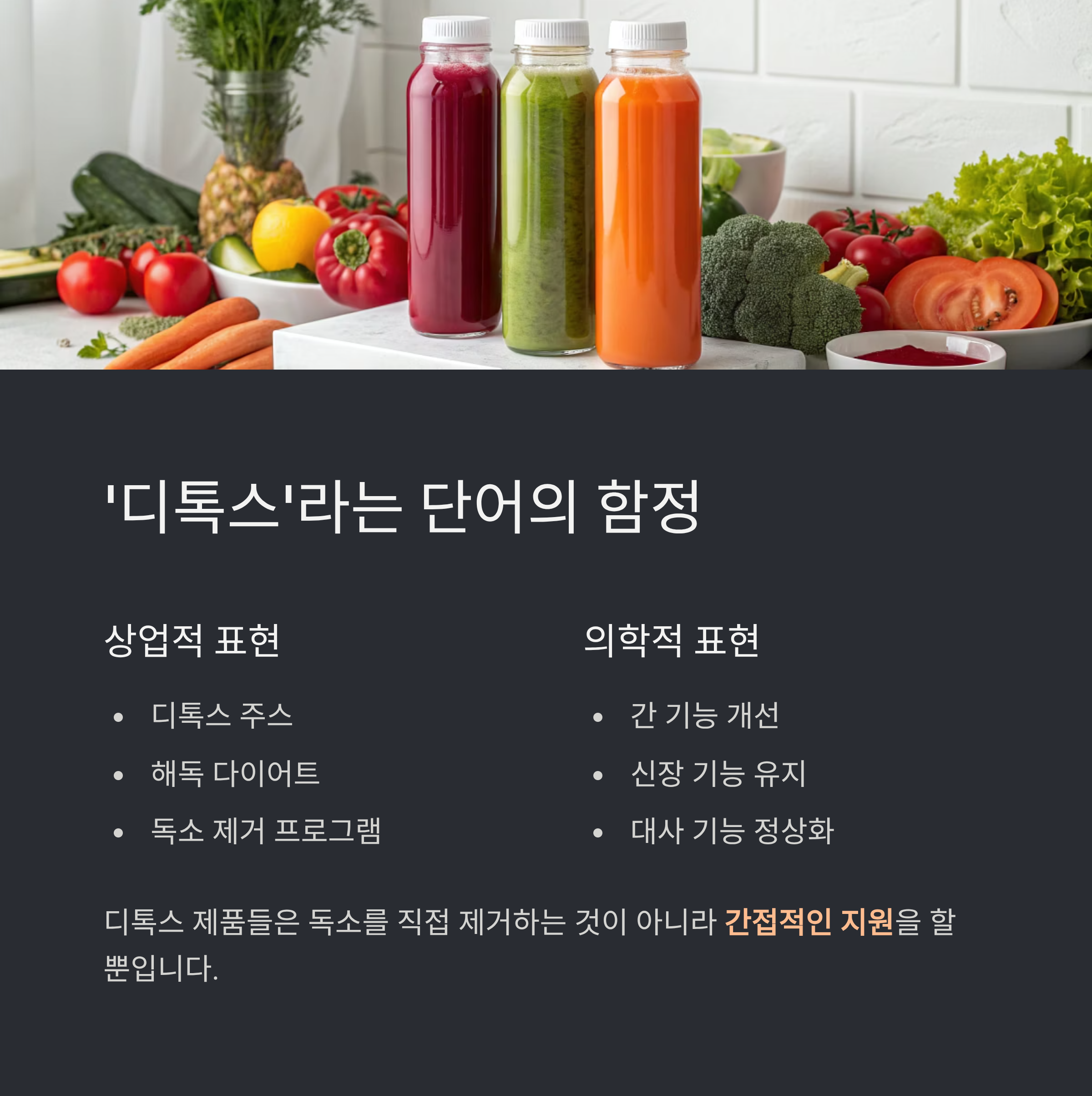 '디톡스'라는 단어는 상업적인 영역에서 자주 쓰이지만, 실제 의학에서는 거의 사용되지 않아요.