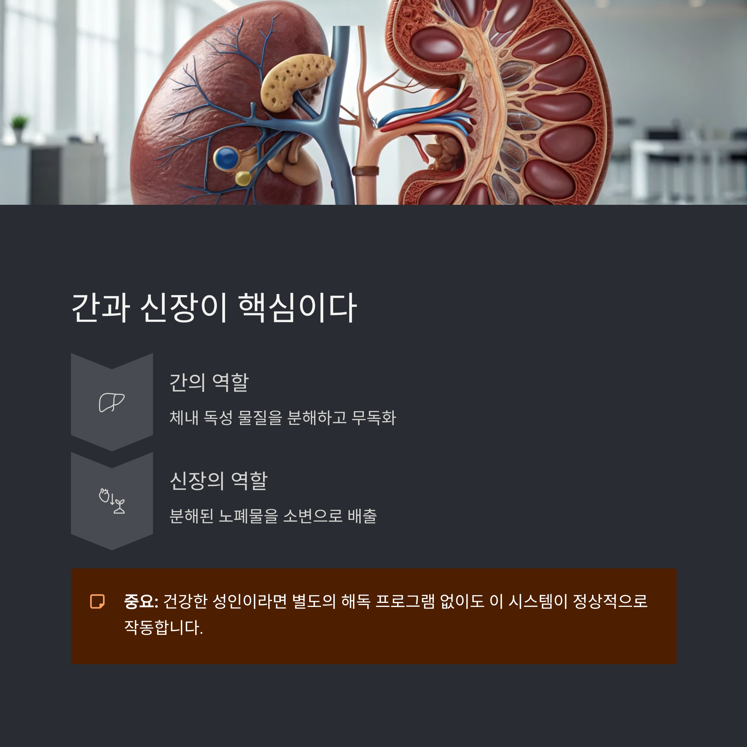 여기서 중요한 점은, 건강한 성인이라면 별도의 해독 프로그램 없이도 이 시스템이 정상적으로 작동한다는 사실입니다.