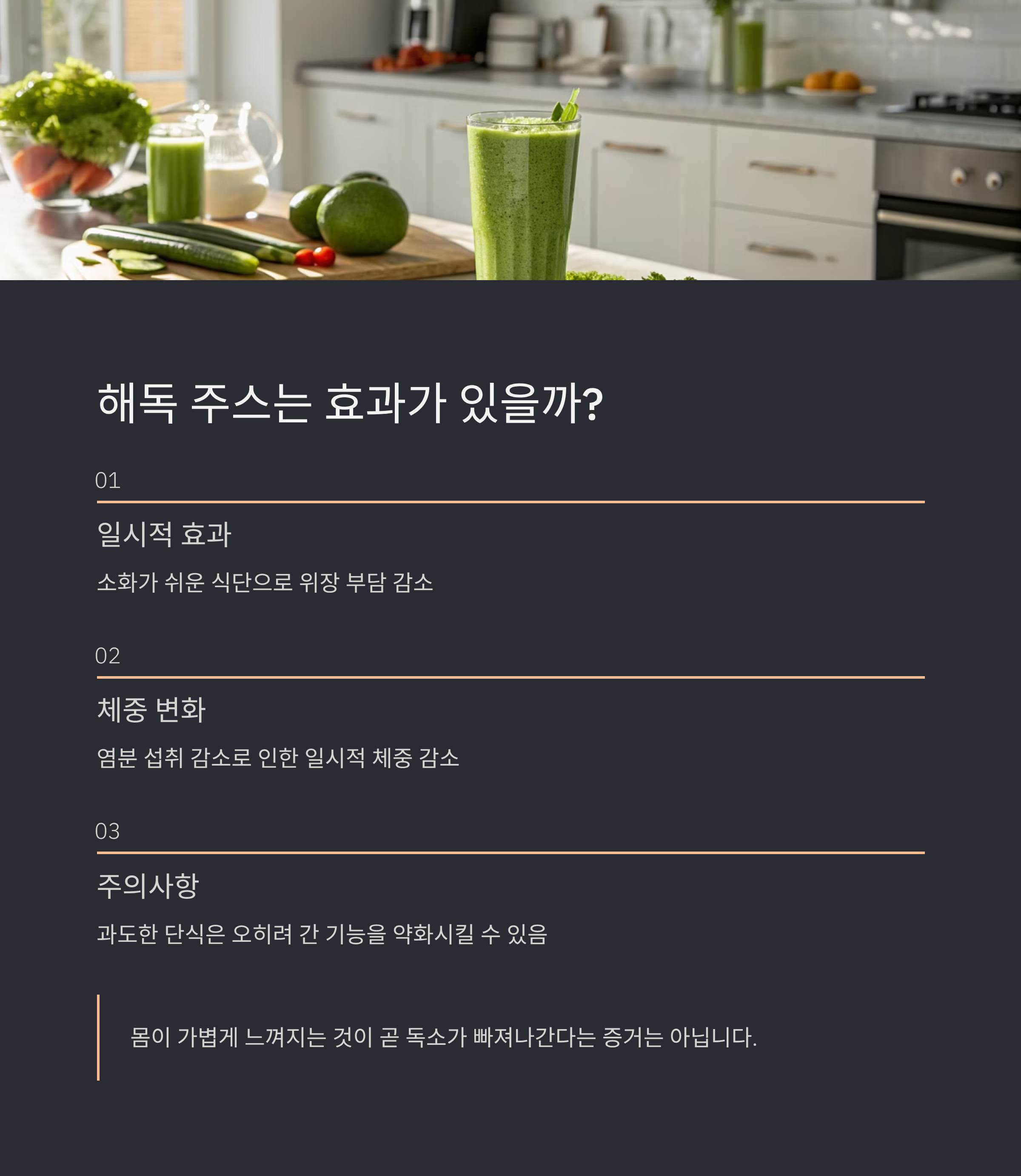 해독 주스, 채소 스무디, 디톡스 워터 등은 일시적으로 몸이 가볍게 느껴질 수 있어요.