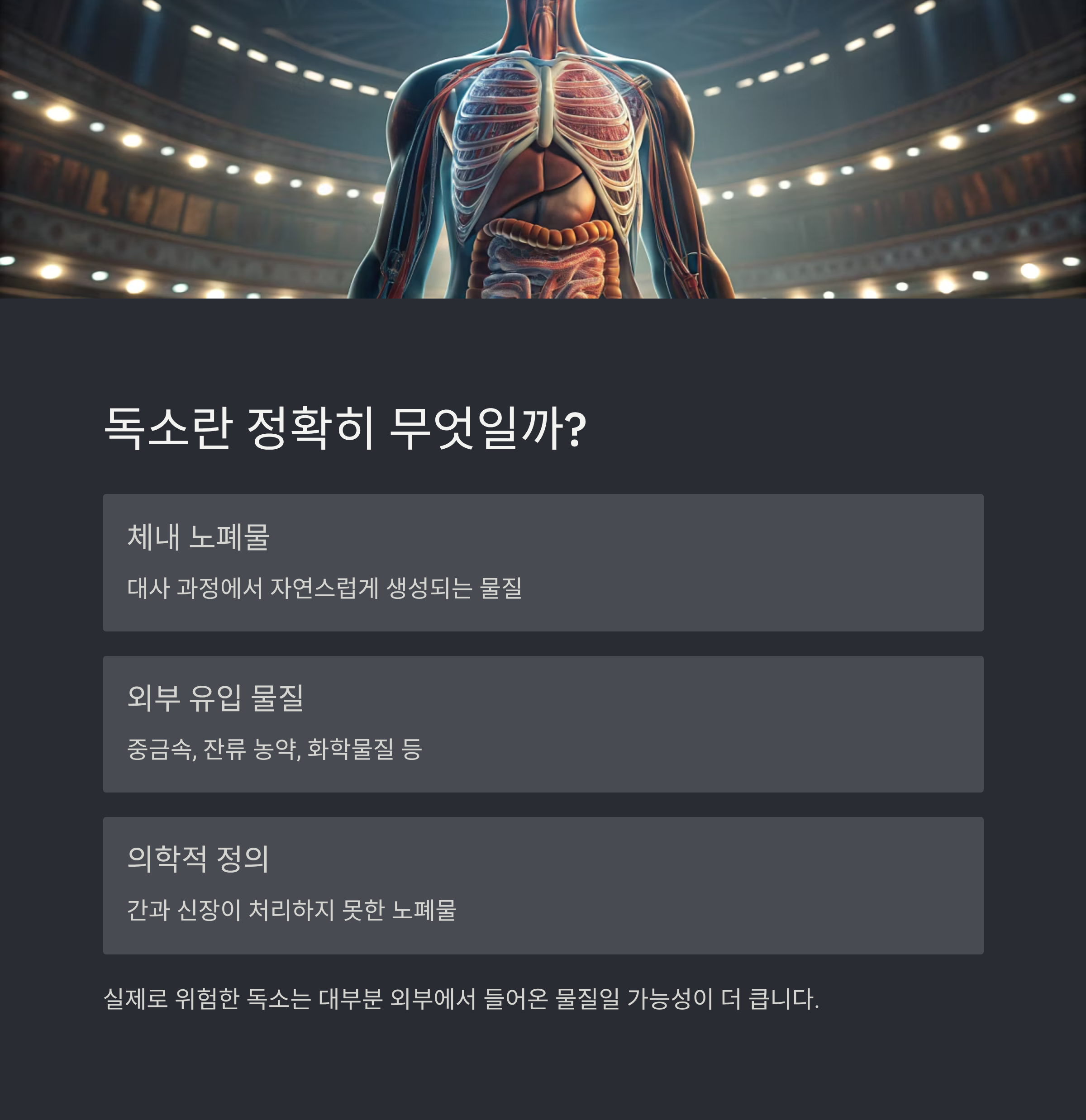 하지만 의학적으로는 우리 몸이 정상적으로 기능하면서 생기는 물질 중, 간이나 신장이 처리하지 못하고 남는 ‘노폐물’이 문제입니다. 즉, 실제로 위험한 독소는 대부분 몸 안에서 생기기보다는 외부에서 들어온 물질일 가능성이 더 커요.