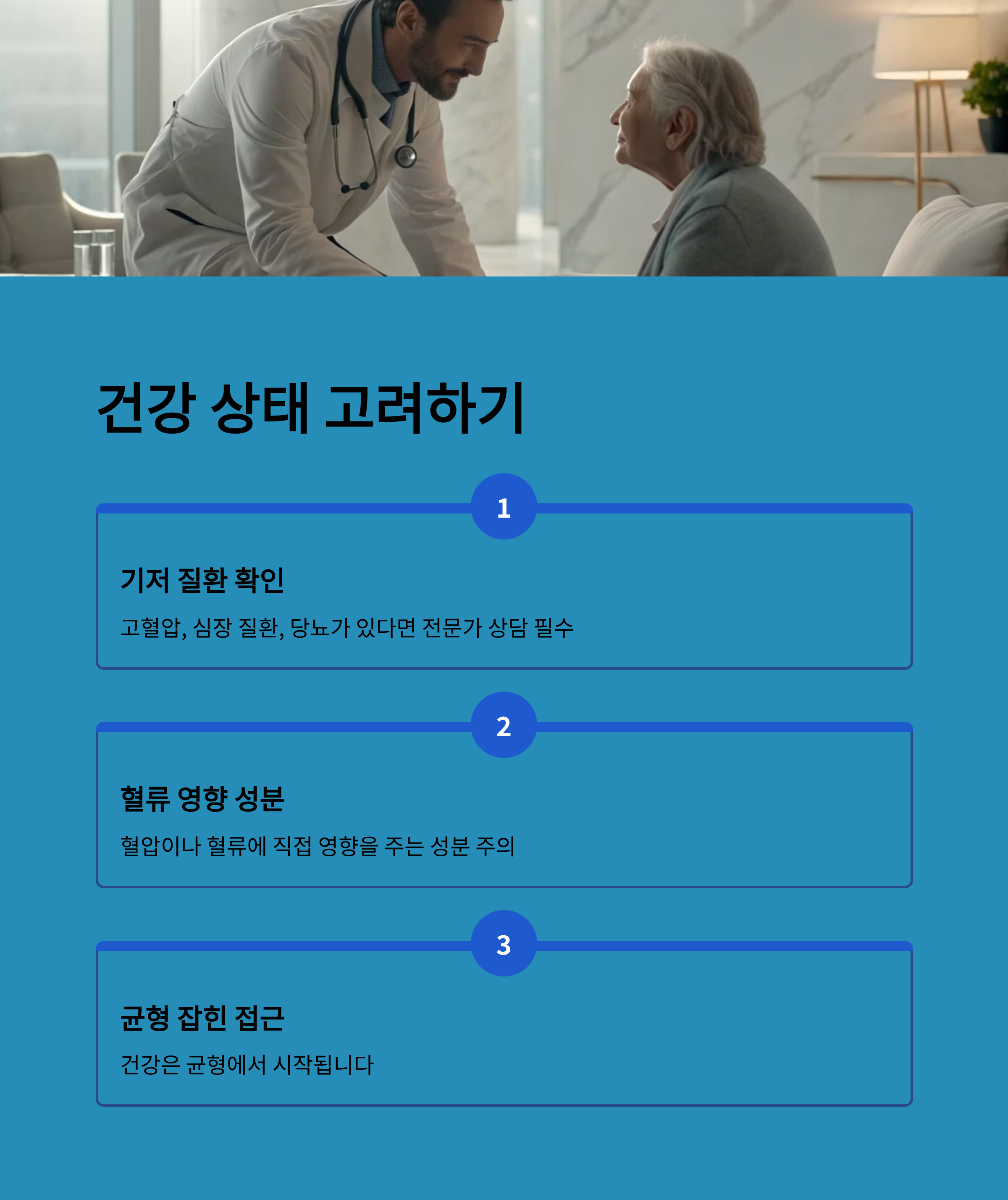 고혈압, 심장 질환, 당뇨 등 기저 질환이 있는 경우에는 반드시 전문가와 상담 후 복용을 결정해야 합니다.