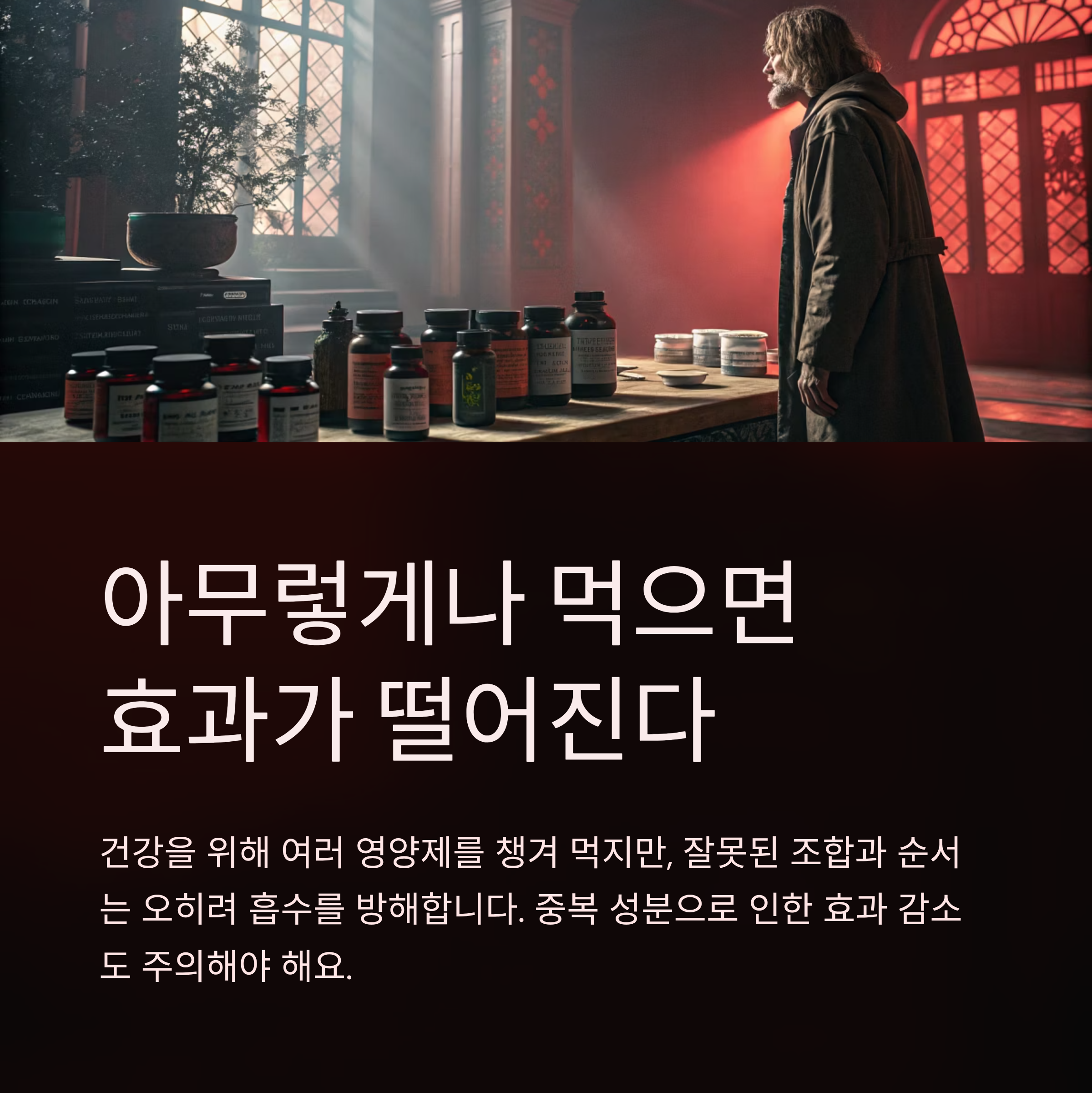 중복되는 성분이 없는지 체크하고, 흡수 방해 조합은 반드시 시간차를 두세요.
