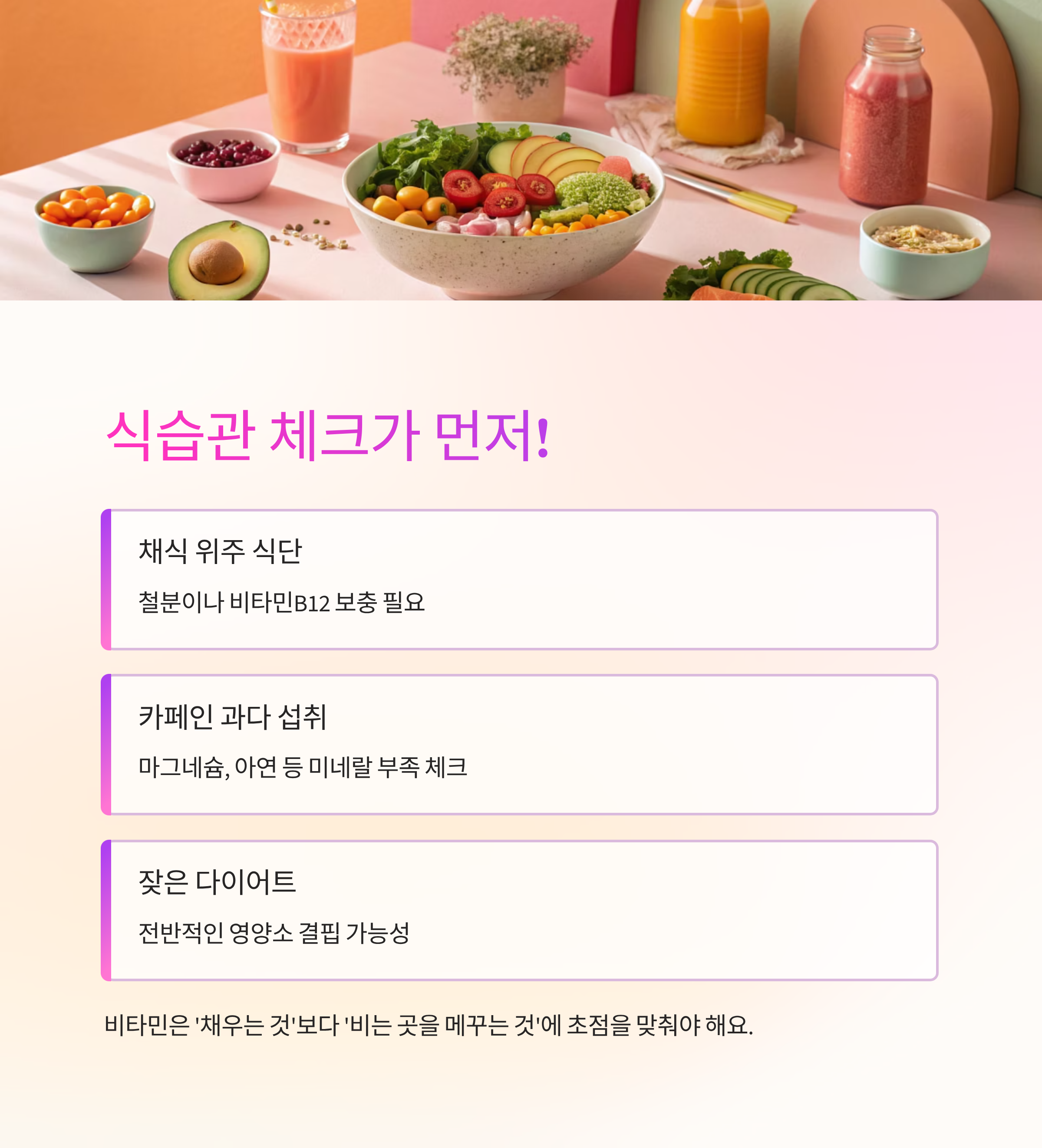 비타민은 ‘채우는 것’보다 ‘비는 곳을 메꾸는 것’에 초점을 맞춰야 하니까요.