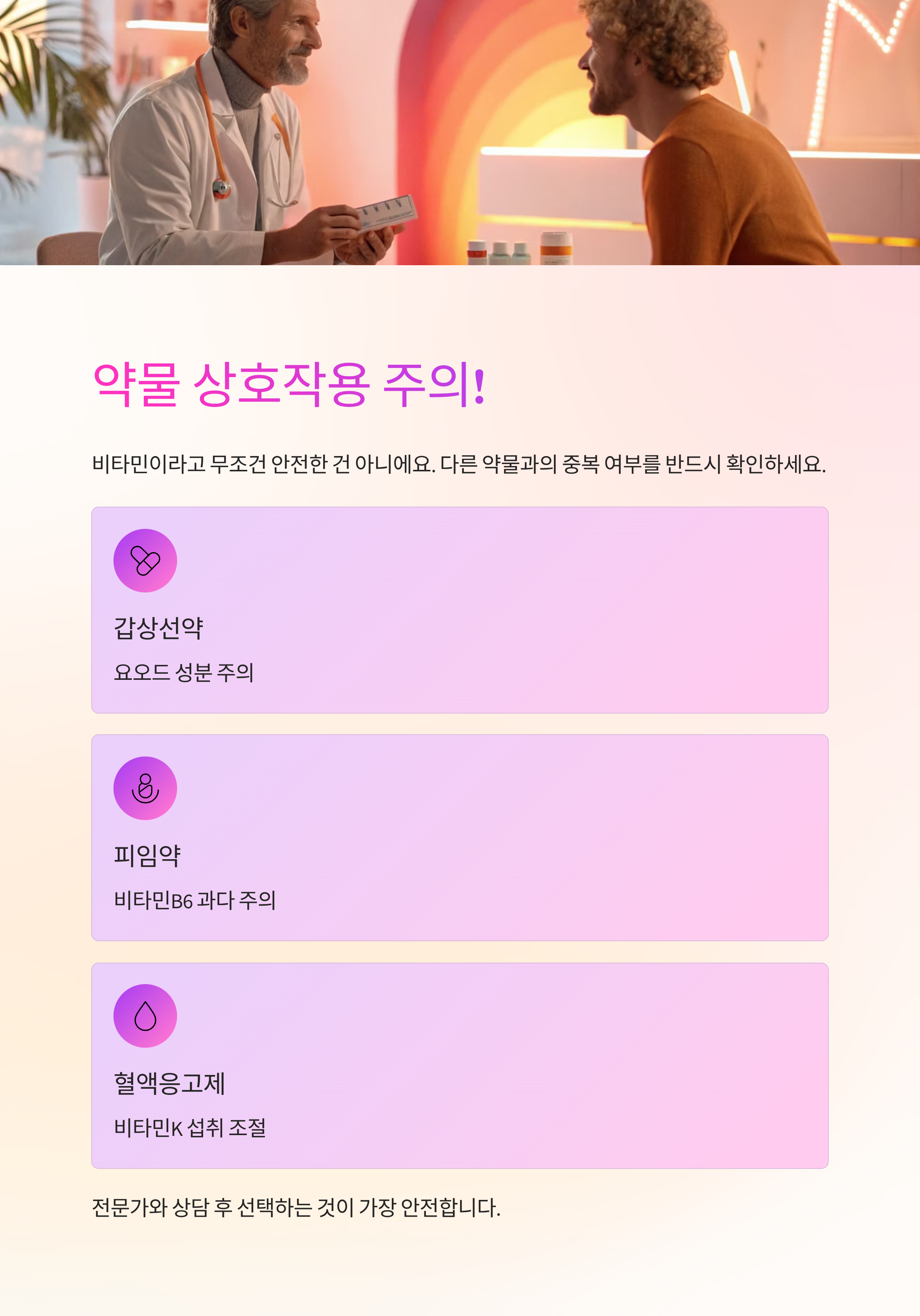 특히 갑상선약, 피임약, 혈액응고제 등과 함께 복용할 경우에는 반드시 전문가와 상담 후 선택하세요.