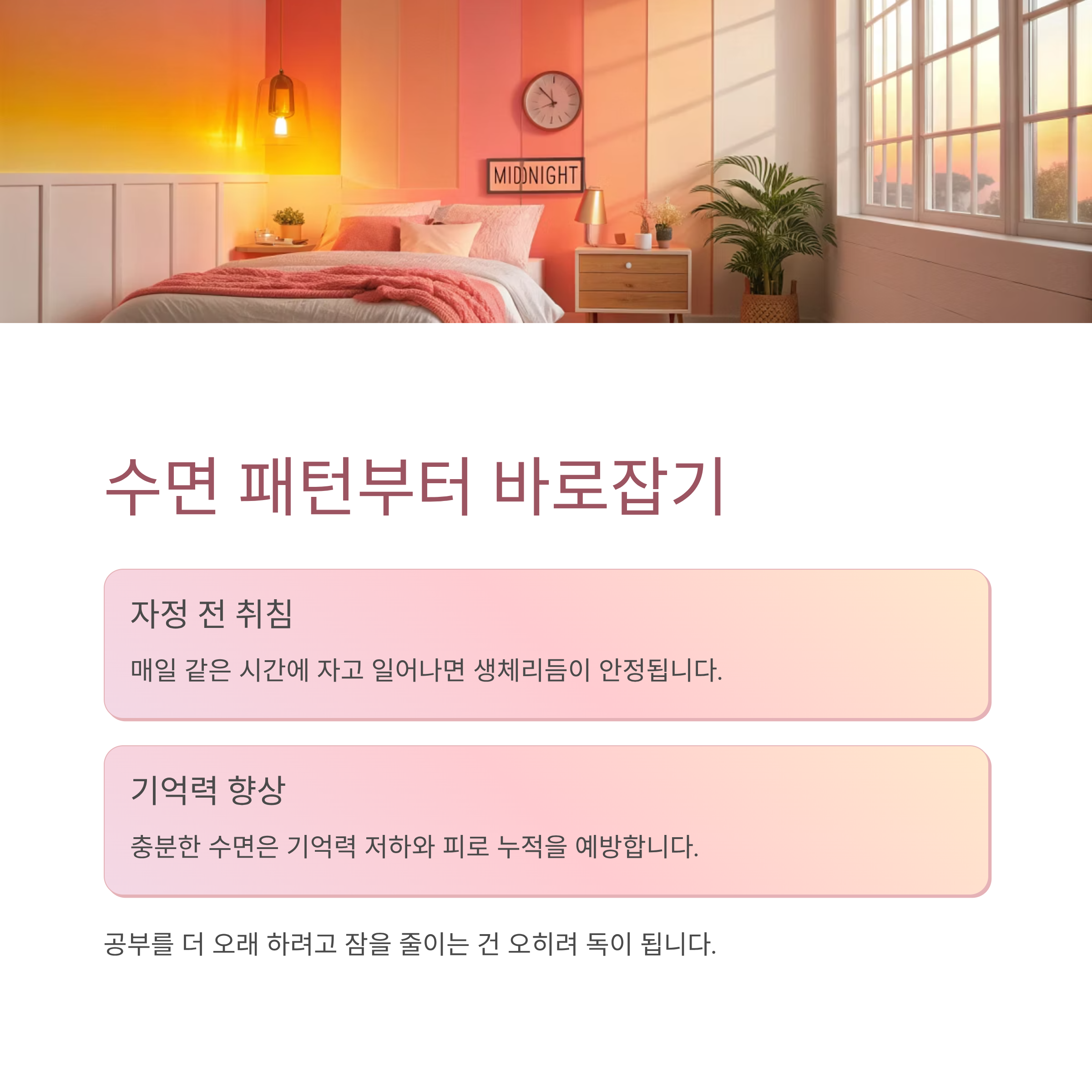 수면 부족은 기억력 저하와 피로 누적의 지름길이니까요.
