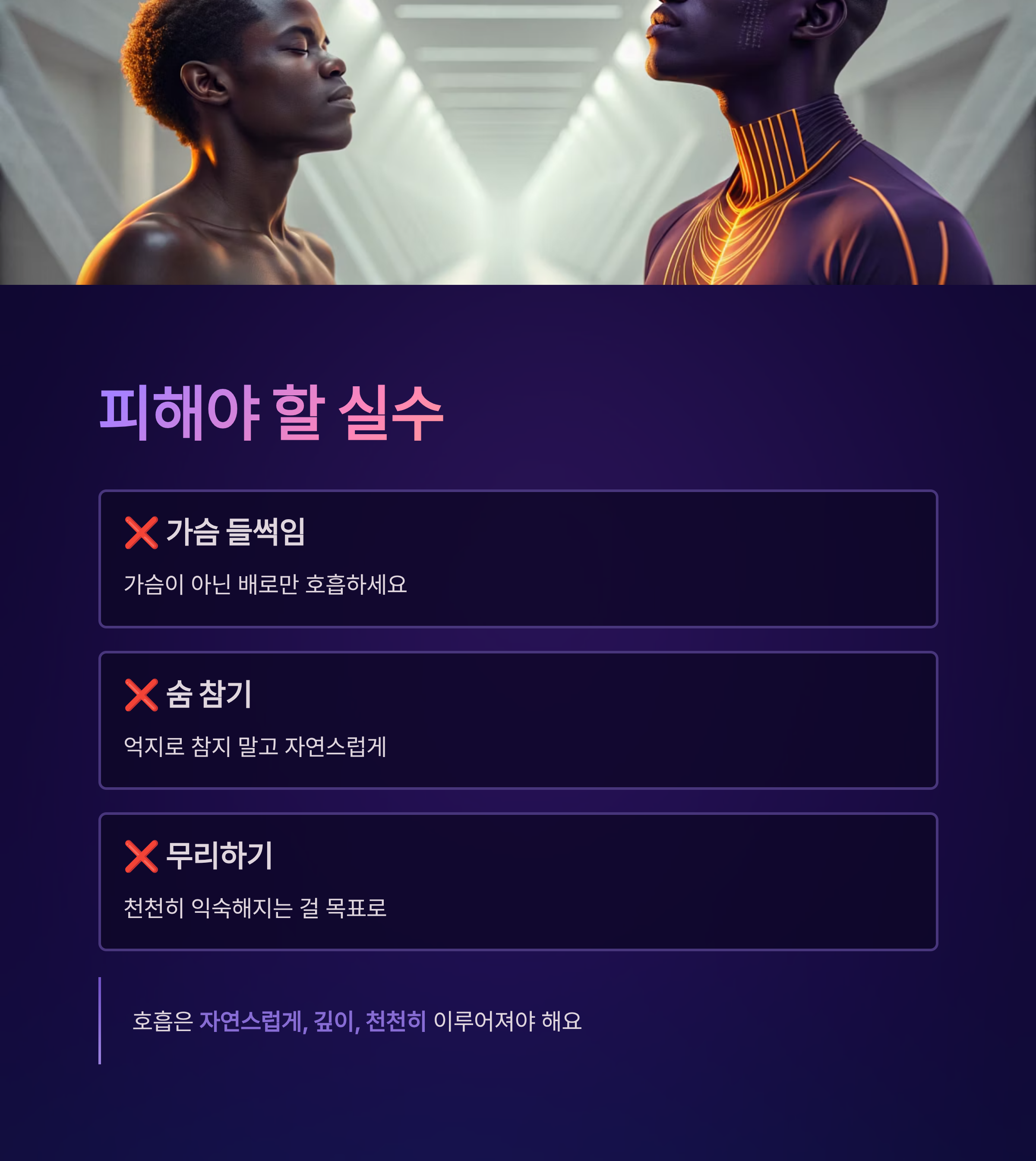 호흡은 억지로 하는 것이 아니라 자연스럽게, 깊이, 천천히 이루어져야 해요.