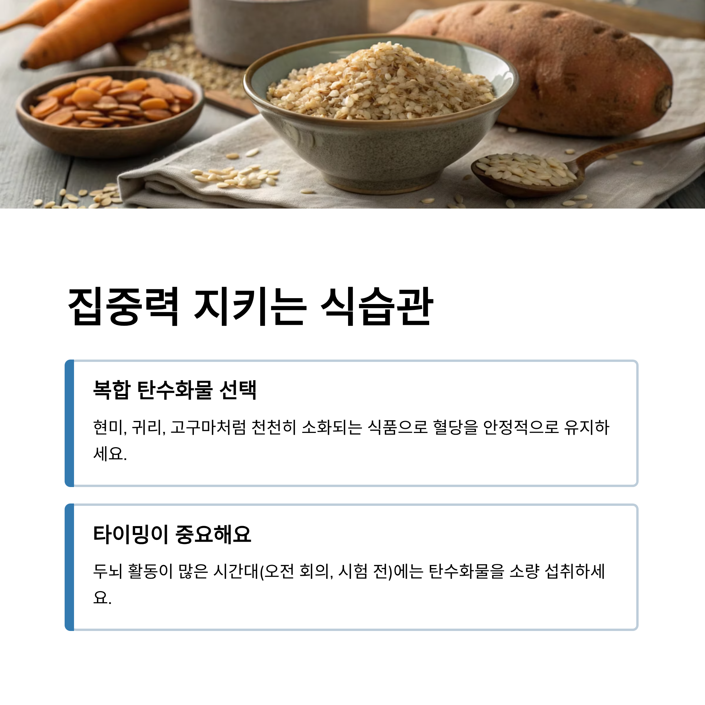 현미, 귀리, 고구마처럼 천천히 소화되는 식품을 선택하면 혈당이 급격히 떨어지지 않아서 뇌도 안정적으로 에너지를 공급받을 수 있어요.