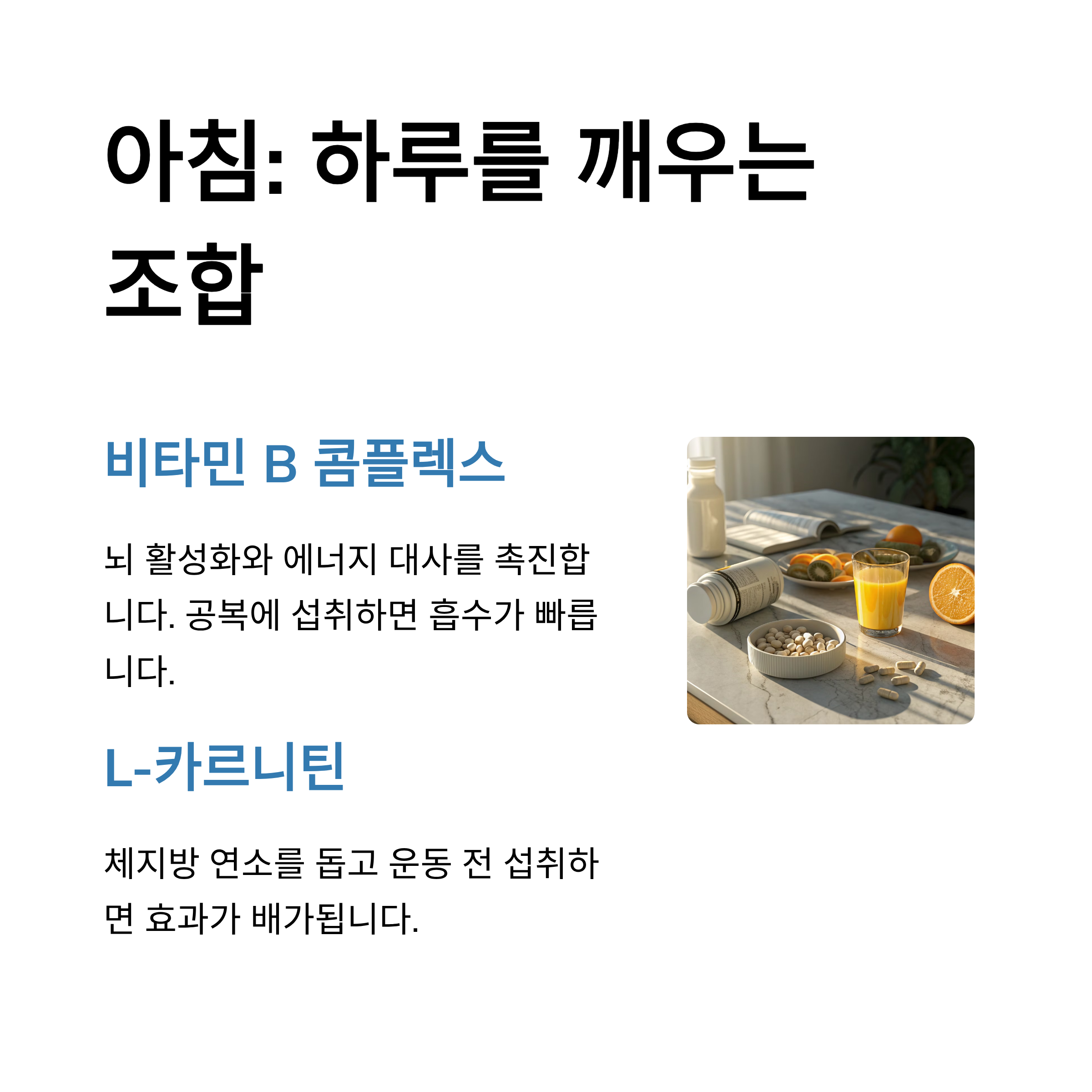 | 아침 | 비타민 B군, L-카르니틴 | 뇌 활성, 대사 촉진 |
