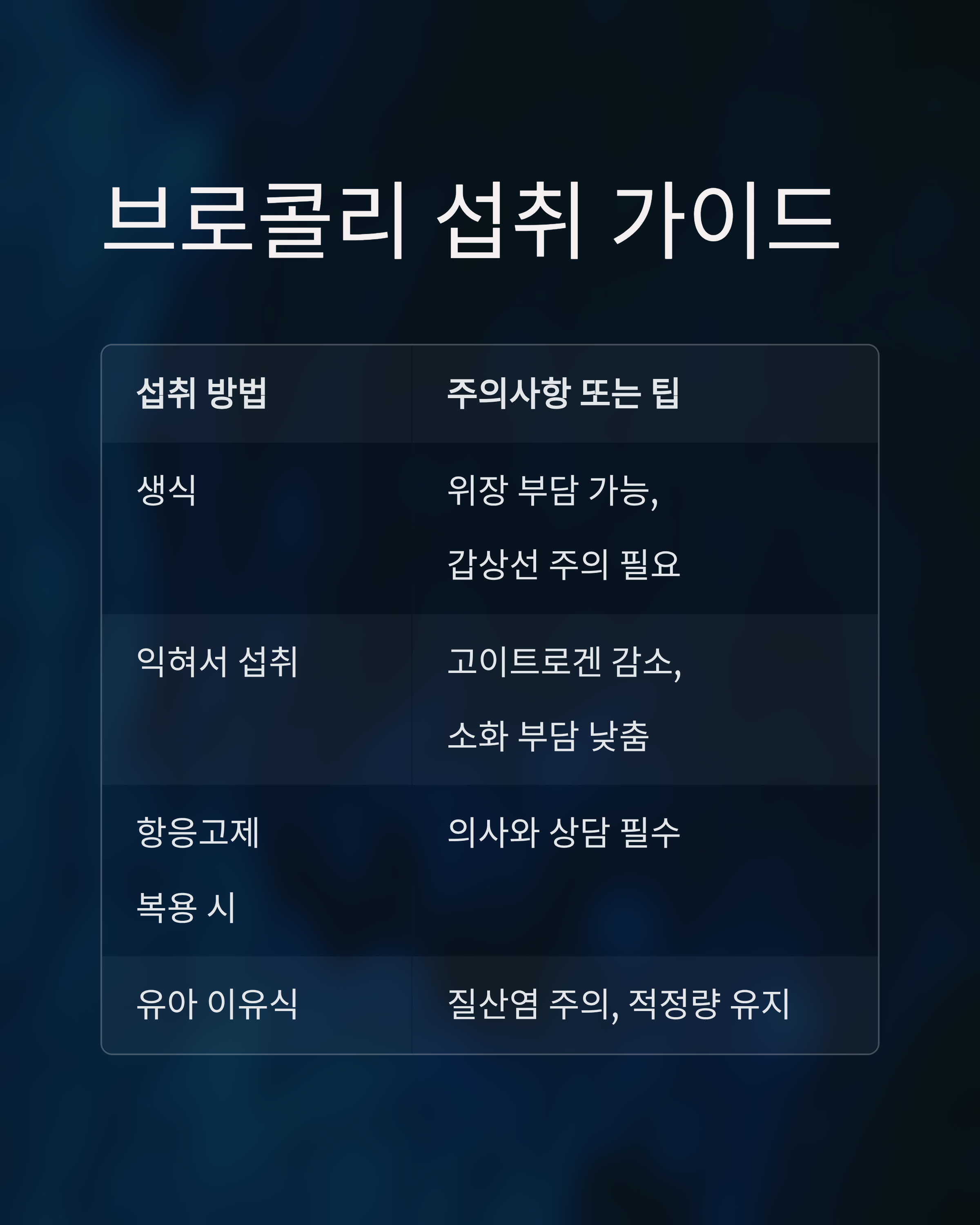 | 익혀서 섭취 | 고이트로겐 감소, 소화 부담 낮춤 |