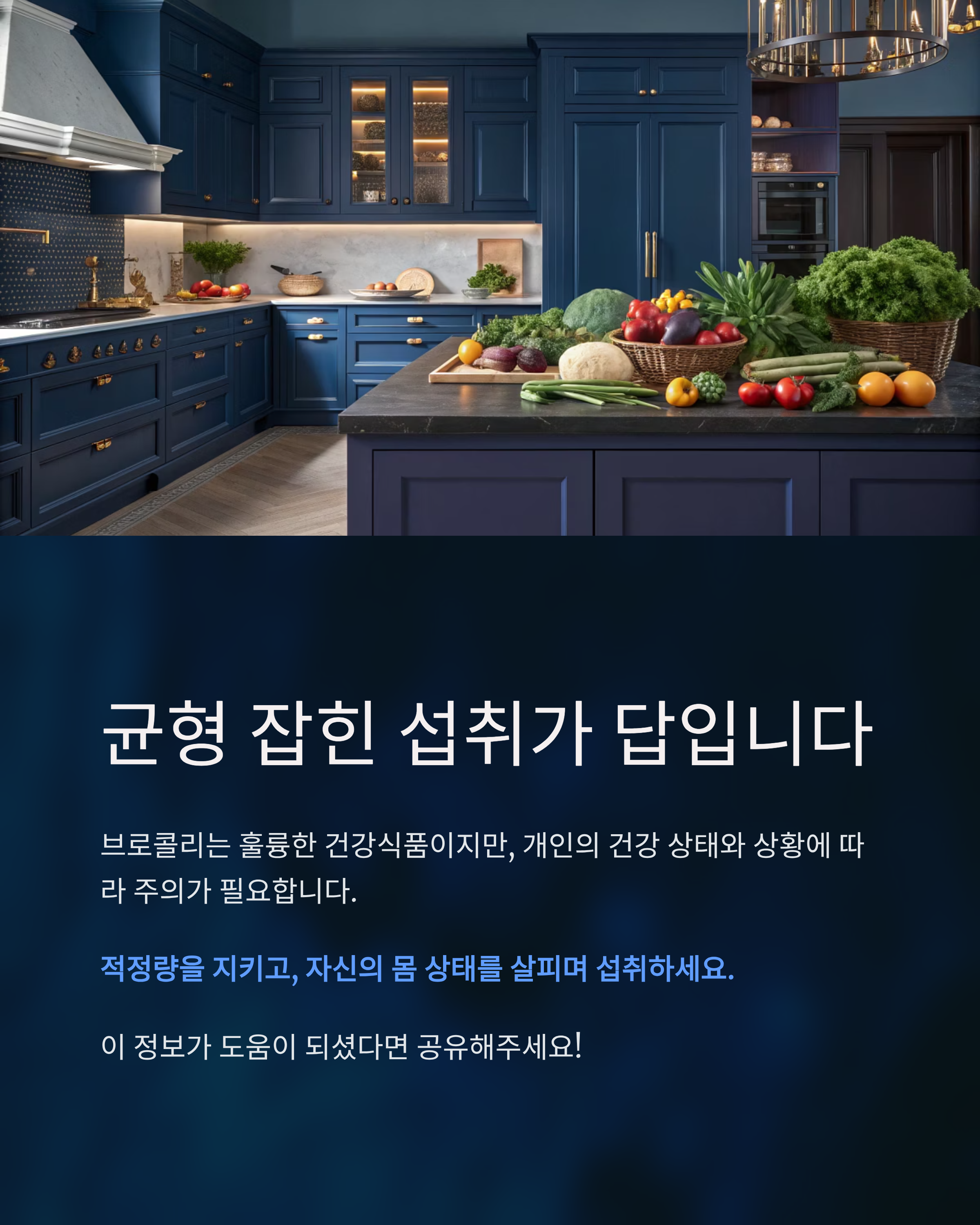 브로콜리는 대표적인 건강식품으로 손꼽히며 많은 이들의 식탁에 오르고 있습니다. 하지만 ‘건강에 좋다’는 이미지에 가려져 잘 알려지지 않은 주의사항들도 존재하는데요. 이번 글에서는 브로콜리를 꾸준히 섭취할 때 신경 써야 할 의외의 요소들, 특히 특정 상황에서 주의가 필요한 이유들을 함께 살펴보겠습니다.