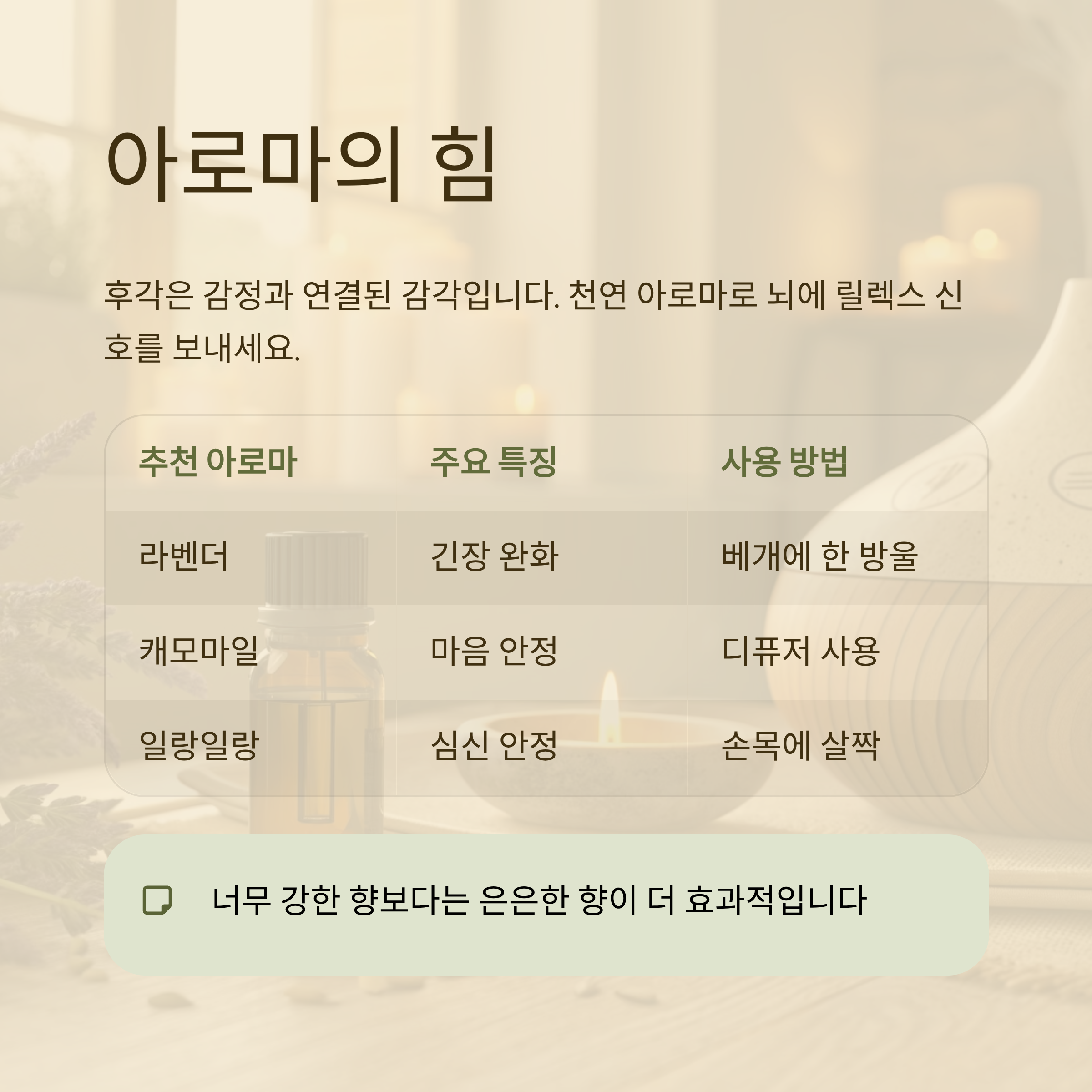 라벤더나 캐모마일 같은 아로마 오일은 뇌의 릴렉스 신호를 유도해 숙면에 도움을 줍니다.