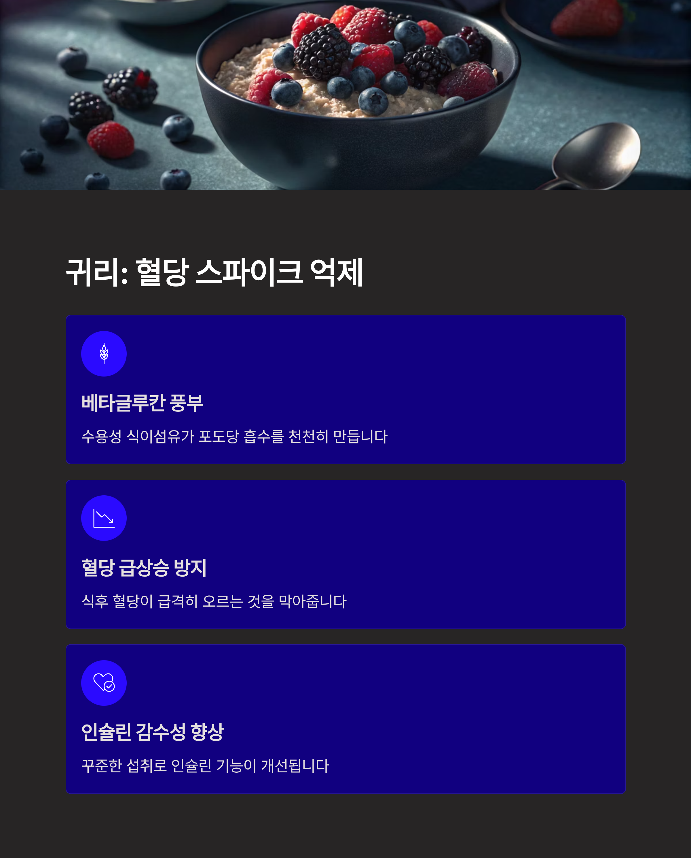 귀리는 수용성 식이섬유 베타글루칸이 풍부해 포도당 흡수를 느리게 만듭니다.