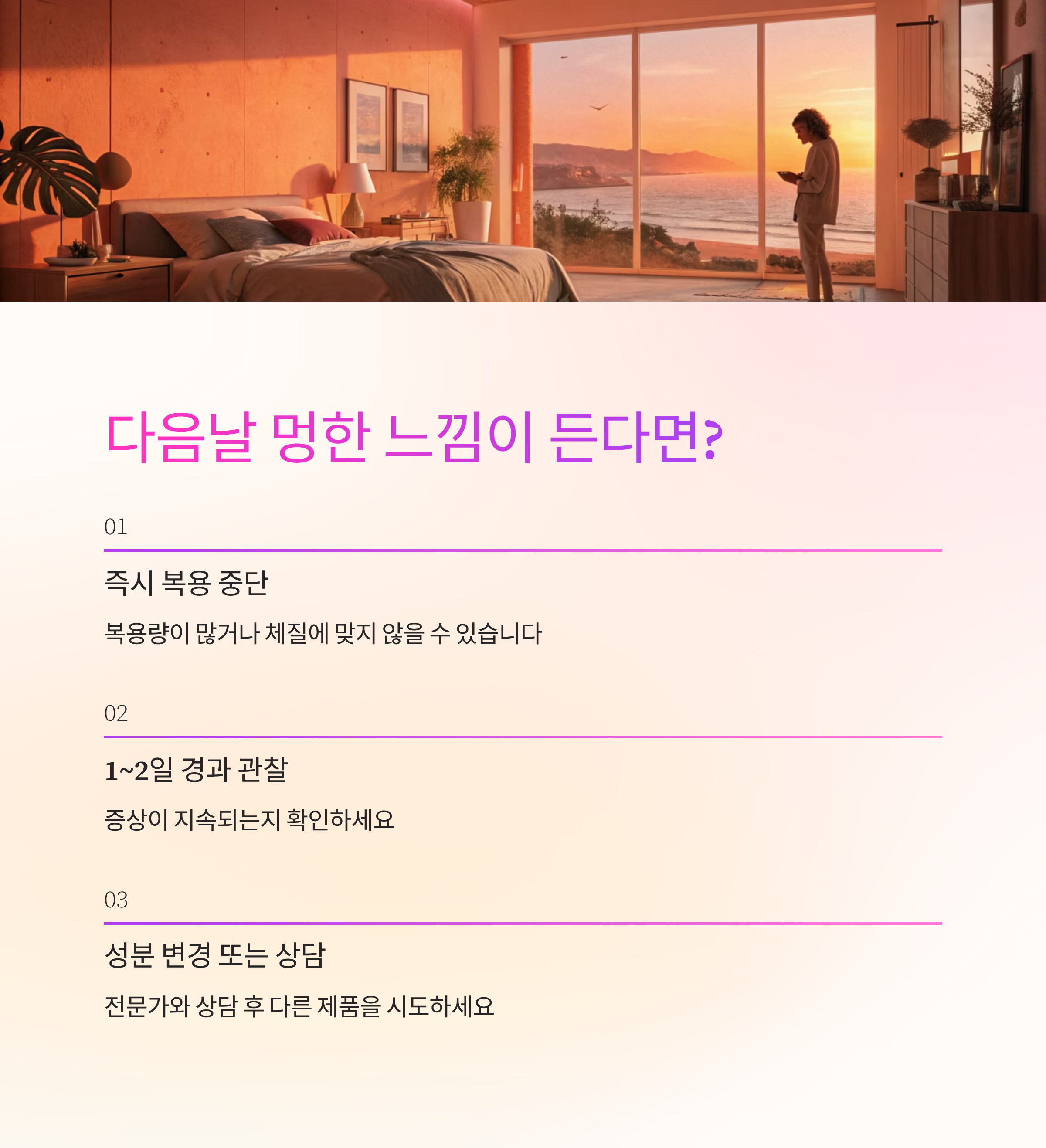 아침에 머리가 멍하거나 피로감이 지속된다면 복용량이 과하거나 체질에 맞지 않을 수 있습니다.