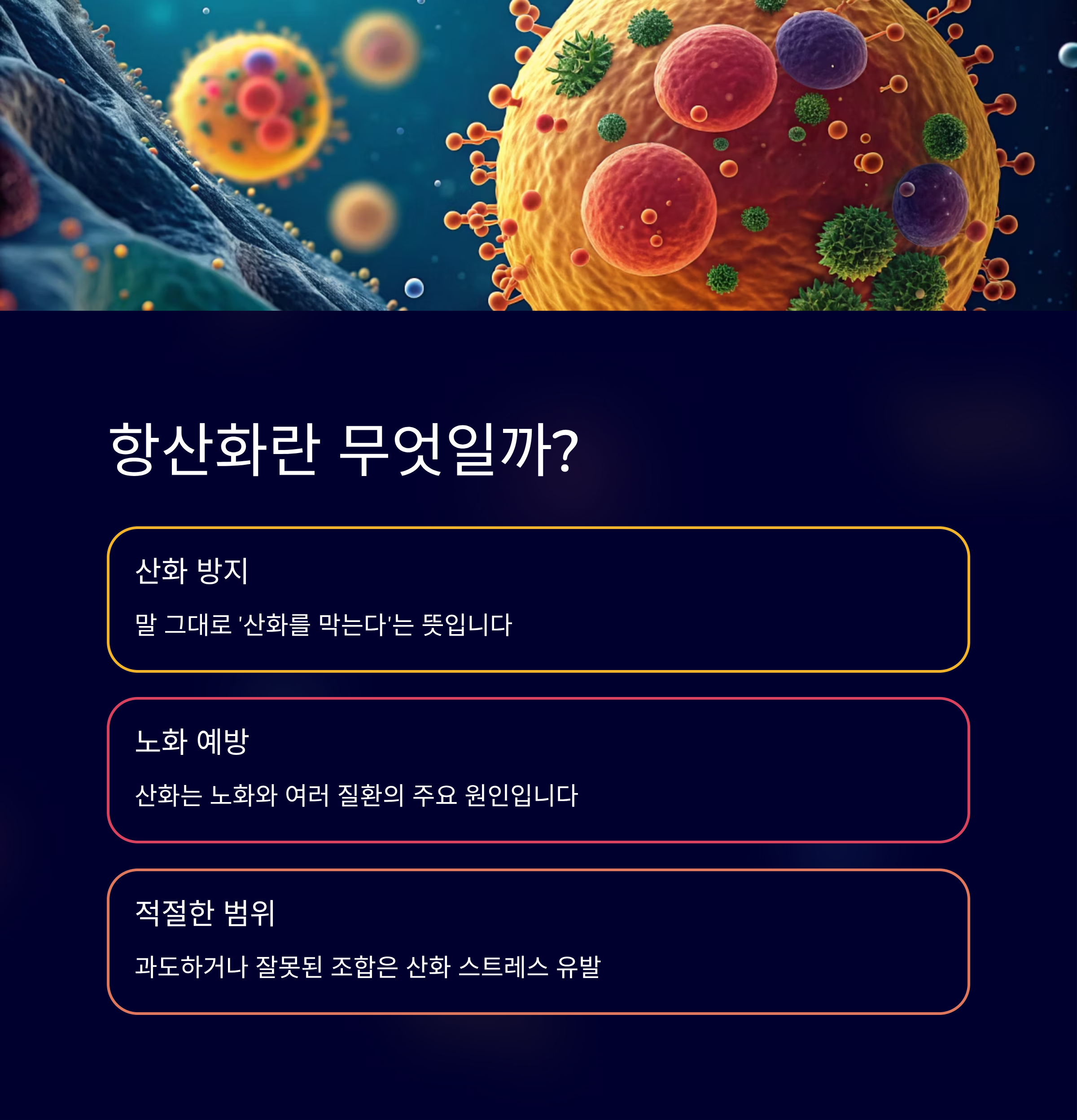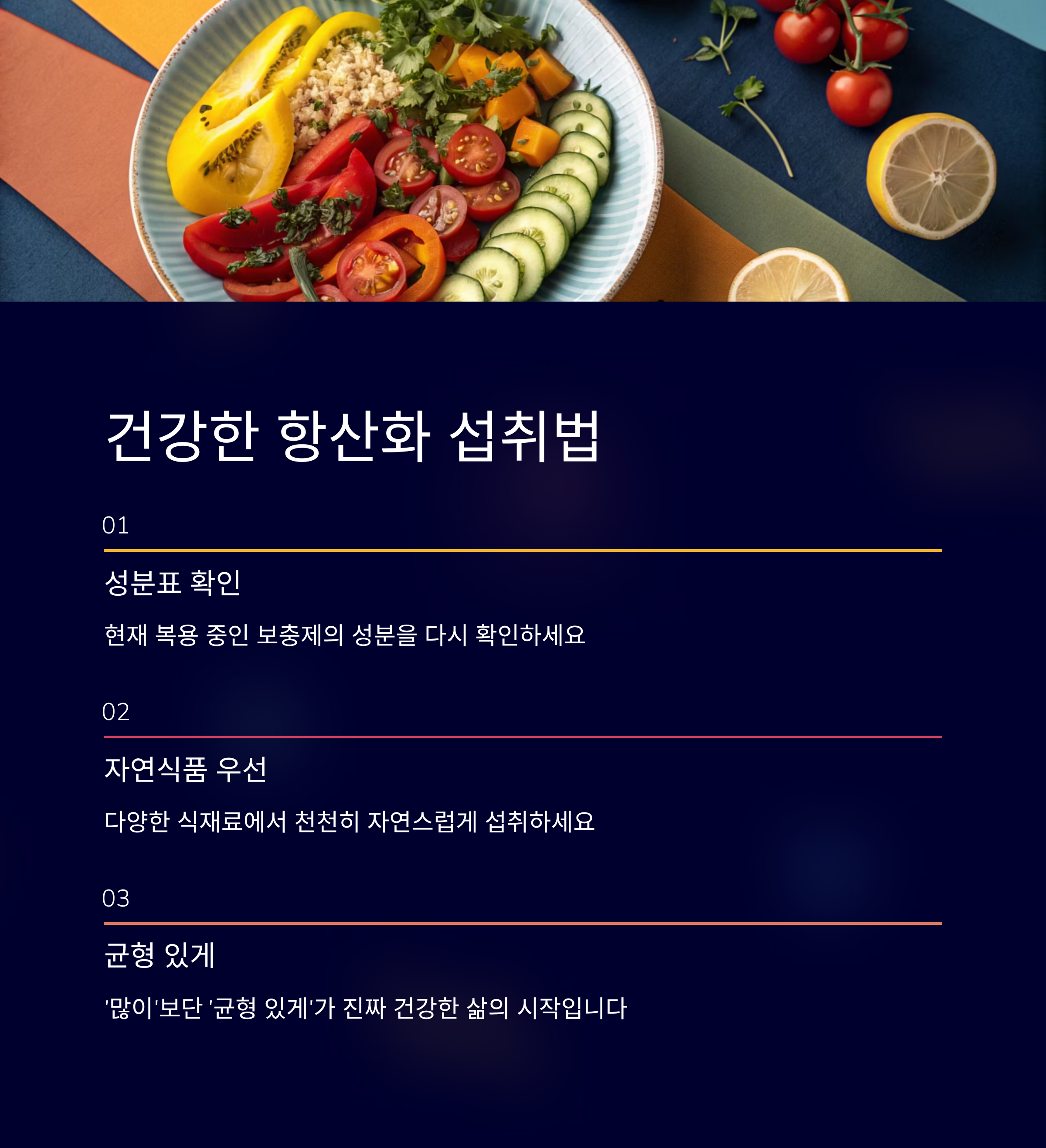 즉, 자연식품 중심의 균형 잡힌 식사가 가장 안전한 항산화 섭취 방법입니다.