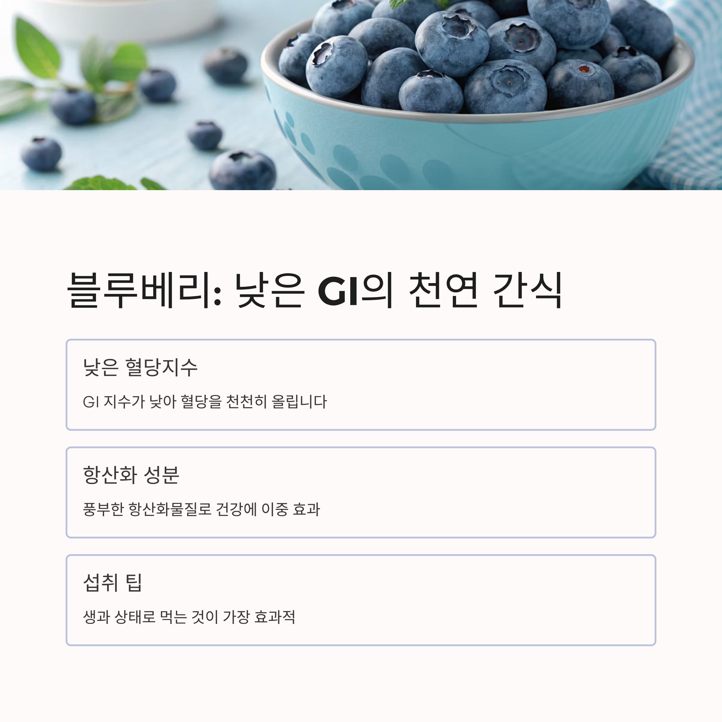 블루베리는 GI 지수(혈당지수)가 낮아, 혈당을 천천히 올리는 과일 중 하나예요.