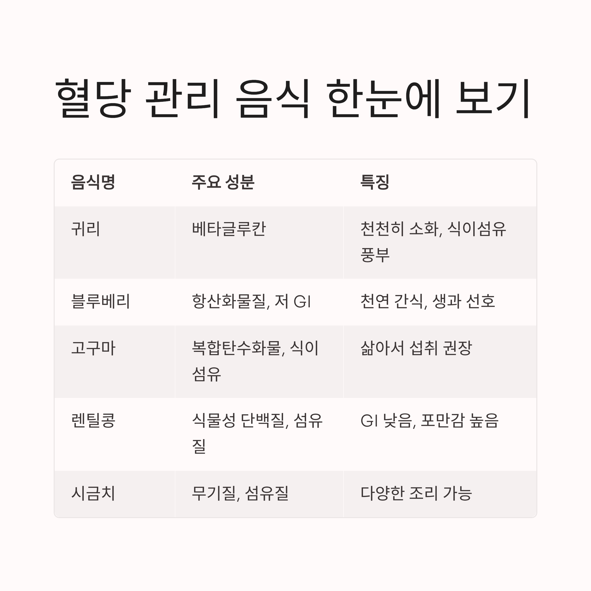 | 귀리 | 베타글루칸 | 천천히 소화, 식이섬유 풍부 |