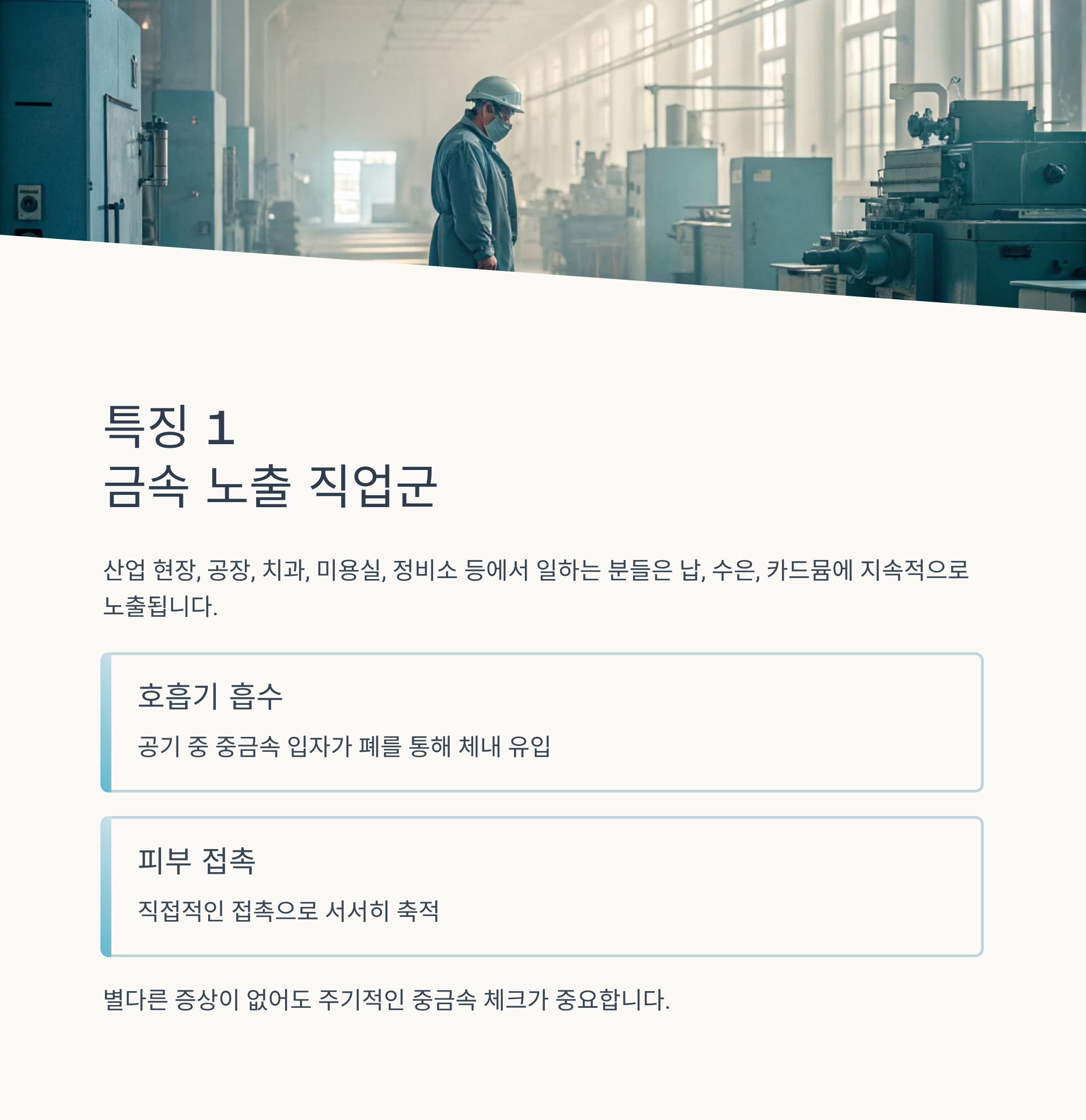 | 공장 근로자 | 다양한 중금속 | 가공 중 발생하는 분진 | 정기 건강검진 필요 |
