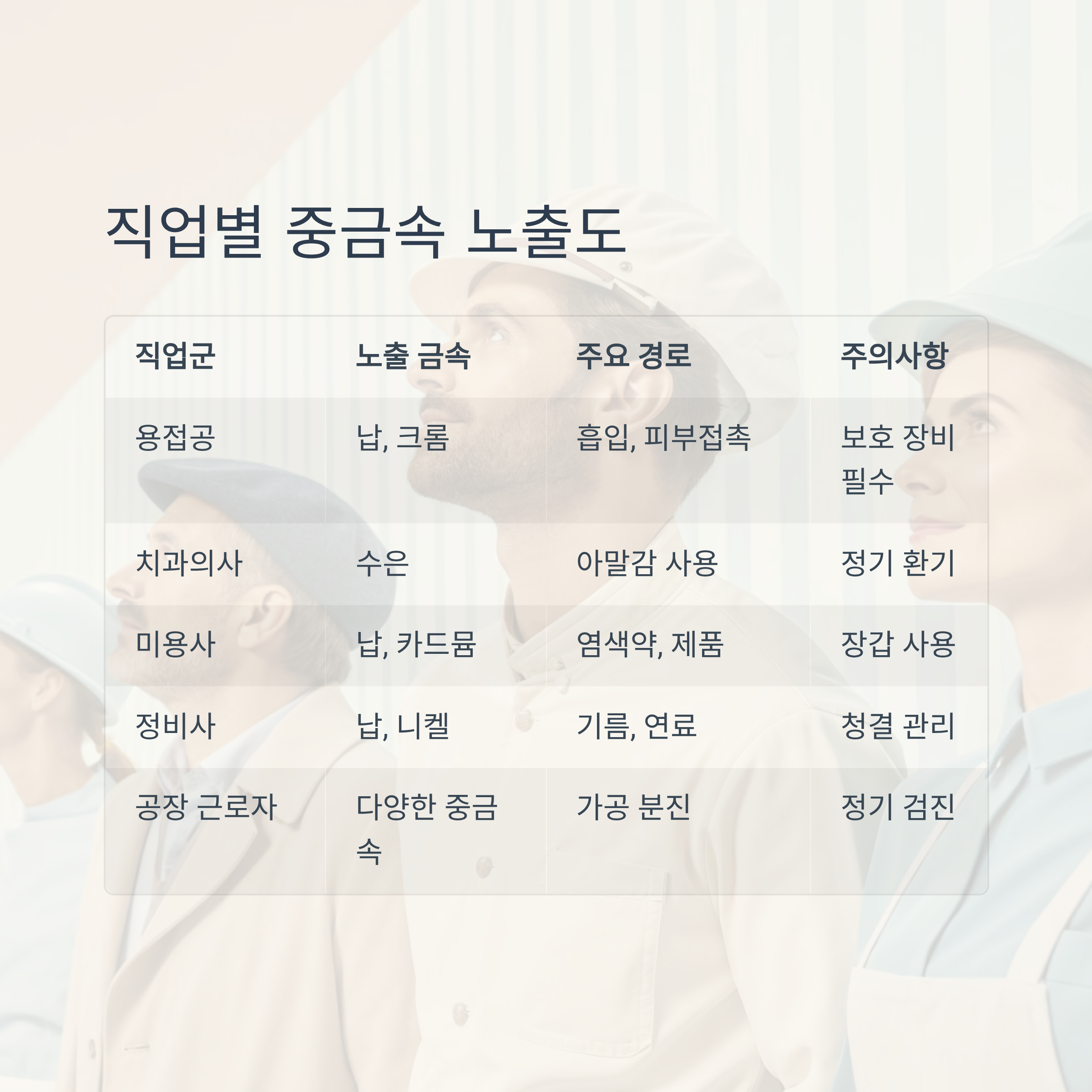 아래 표는 일상에서 중금속 노출 가능성이 높은 직업군을 정리한 자료입니다.