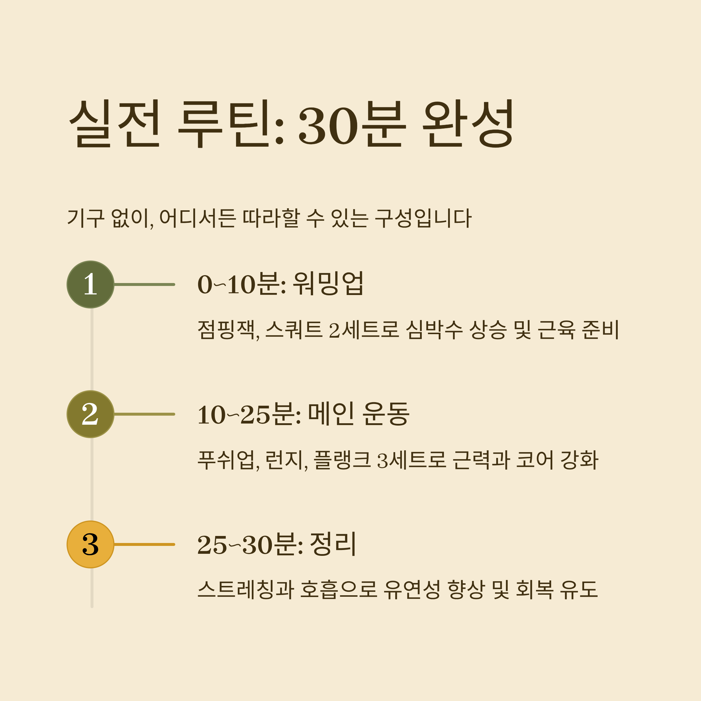 | 25~30분 | 스트레칭 & 호흡 정리 | 1세트 | 유연성 향상, 회복 유도 |