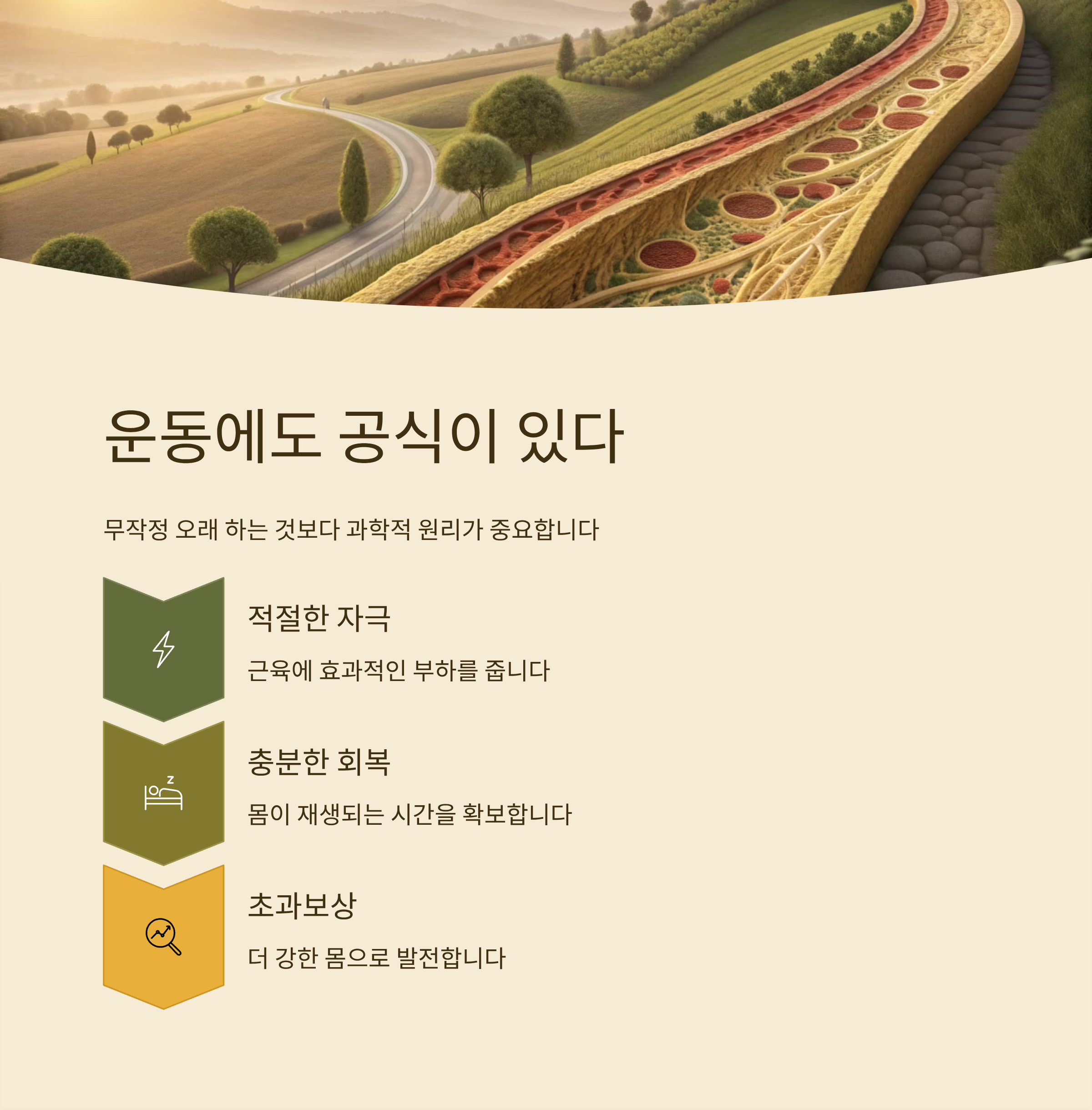 운동 생리학에서는 "적절한 자극 → 회복 → 초과보상" 이라는 구조가 중요하다고 이야기해요.