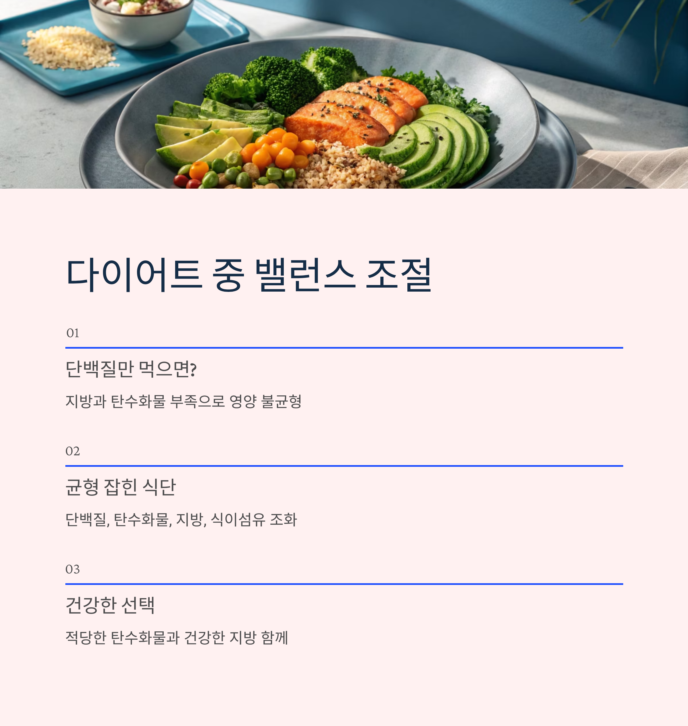 균형 잡힌 식단은 단백질, 탄수화물, 지방, 식이섬유가 모두 조화롭게 포함돼야 해요.