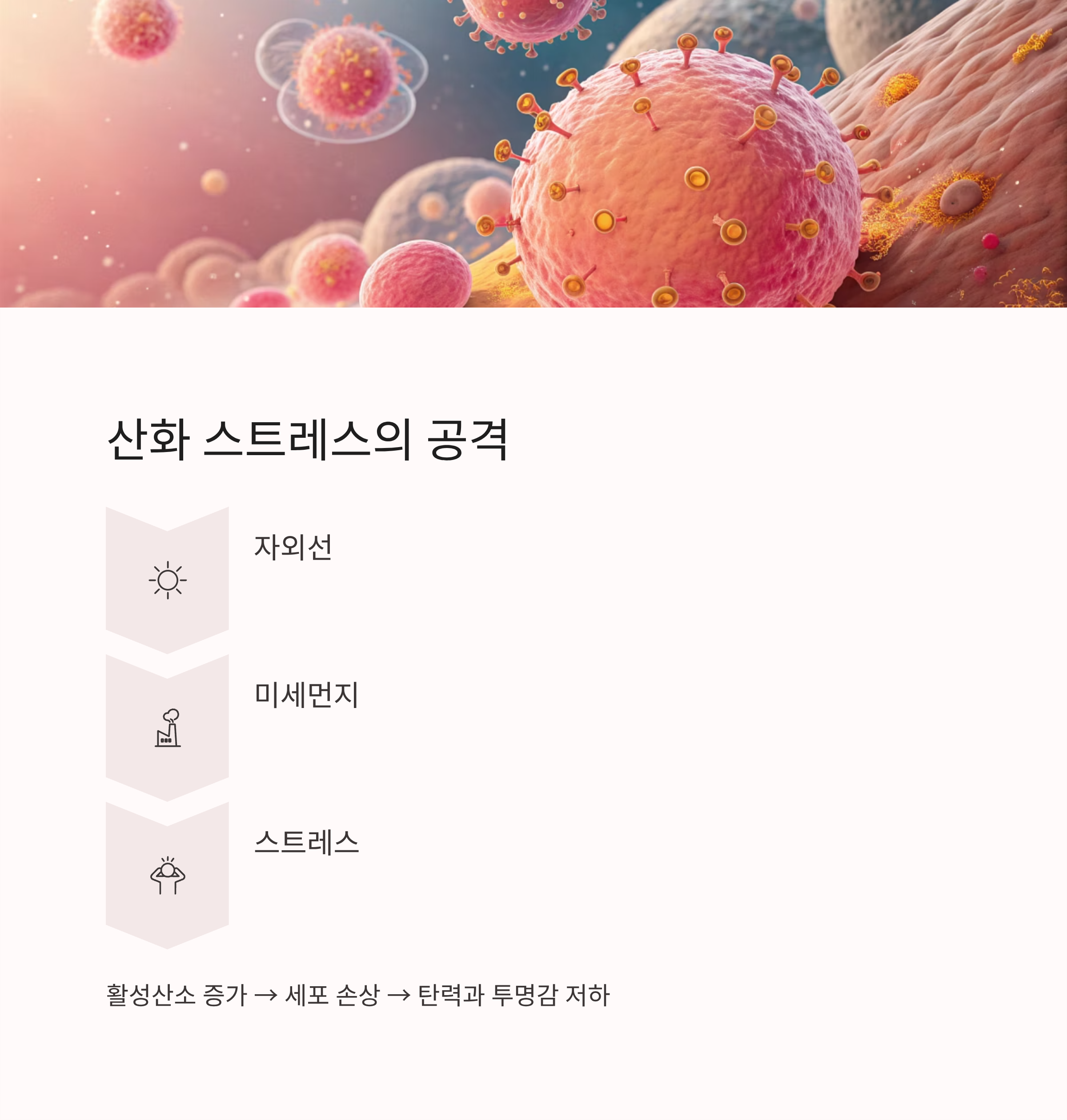 자외선, 미세먼지, 스트레스는 피부 세포를 공격하는 활성산소를 증가시킵니다. 이로 인해 세포가 손상되고, 피부의 탄력과 맑음이 떨어집니다.