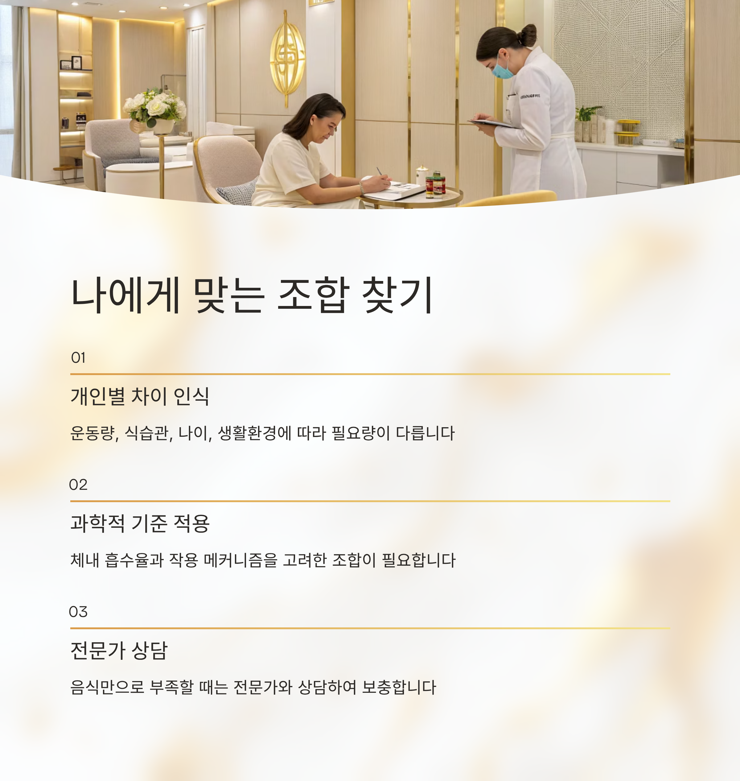즉, 과학적인 기준으로 내 몸 상태를 이해하고 맞춤형 조합을 찾는 것이 중요합니다.