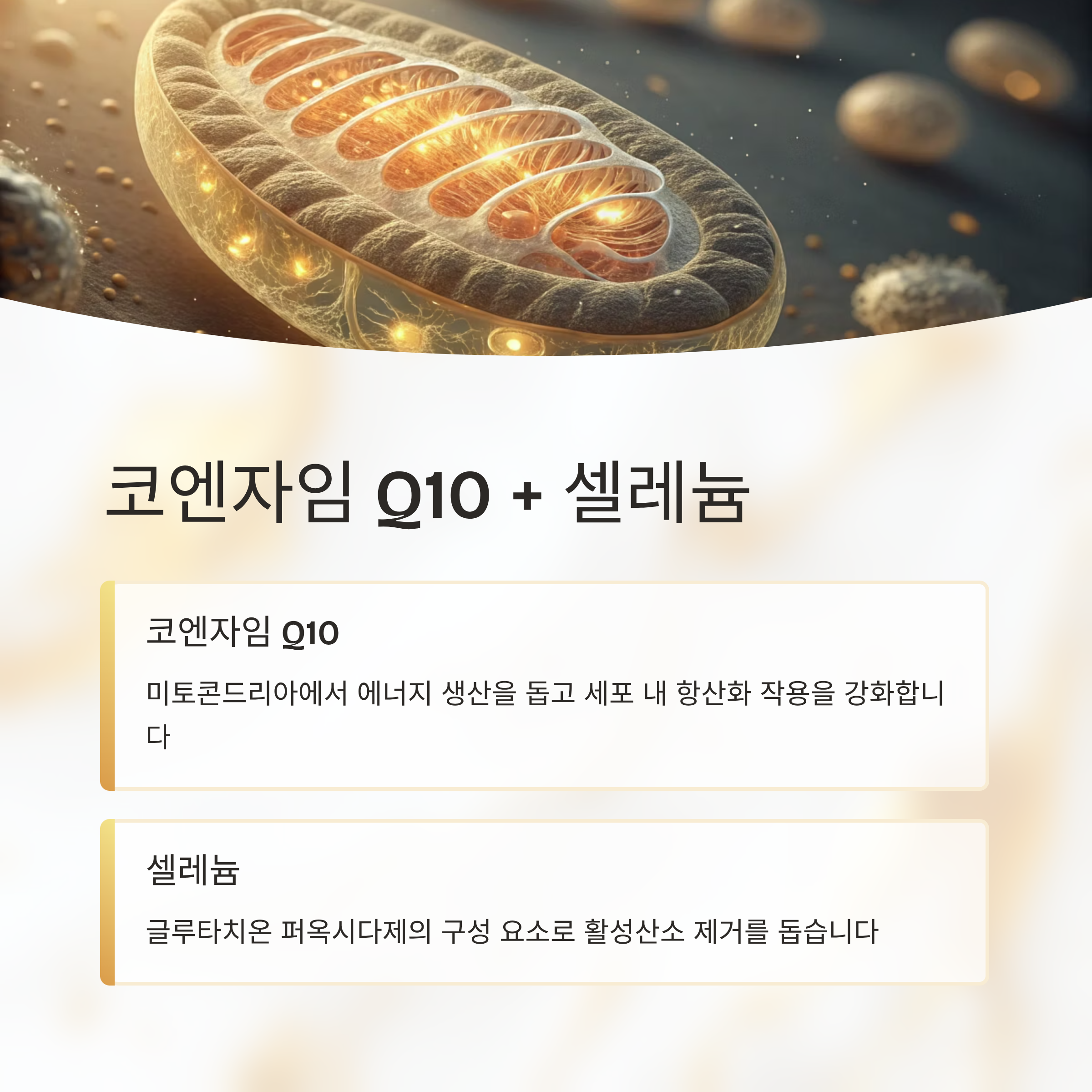 | 코엔자임 Q10 | 미토콘드리아 | 세포 에너지·항산화 상승 |
