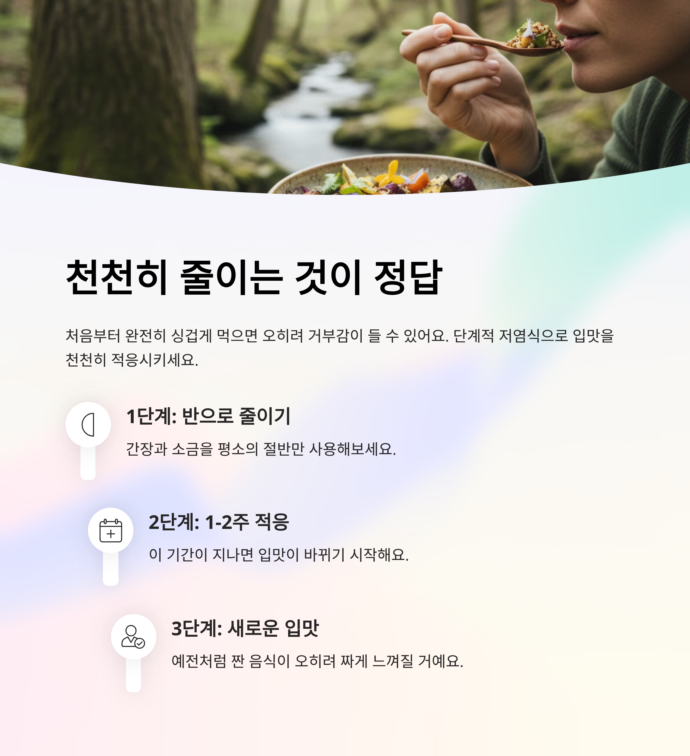 - 2–3주만 꾸준히 실천해도 짠맛 민감도가 달라집니다.