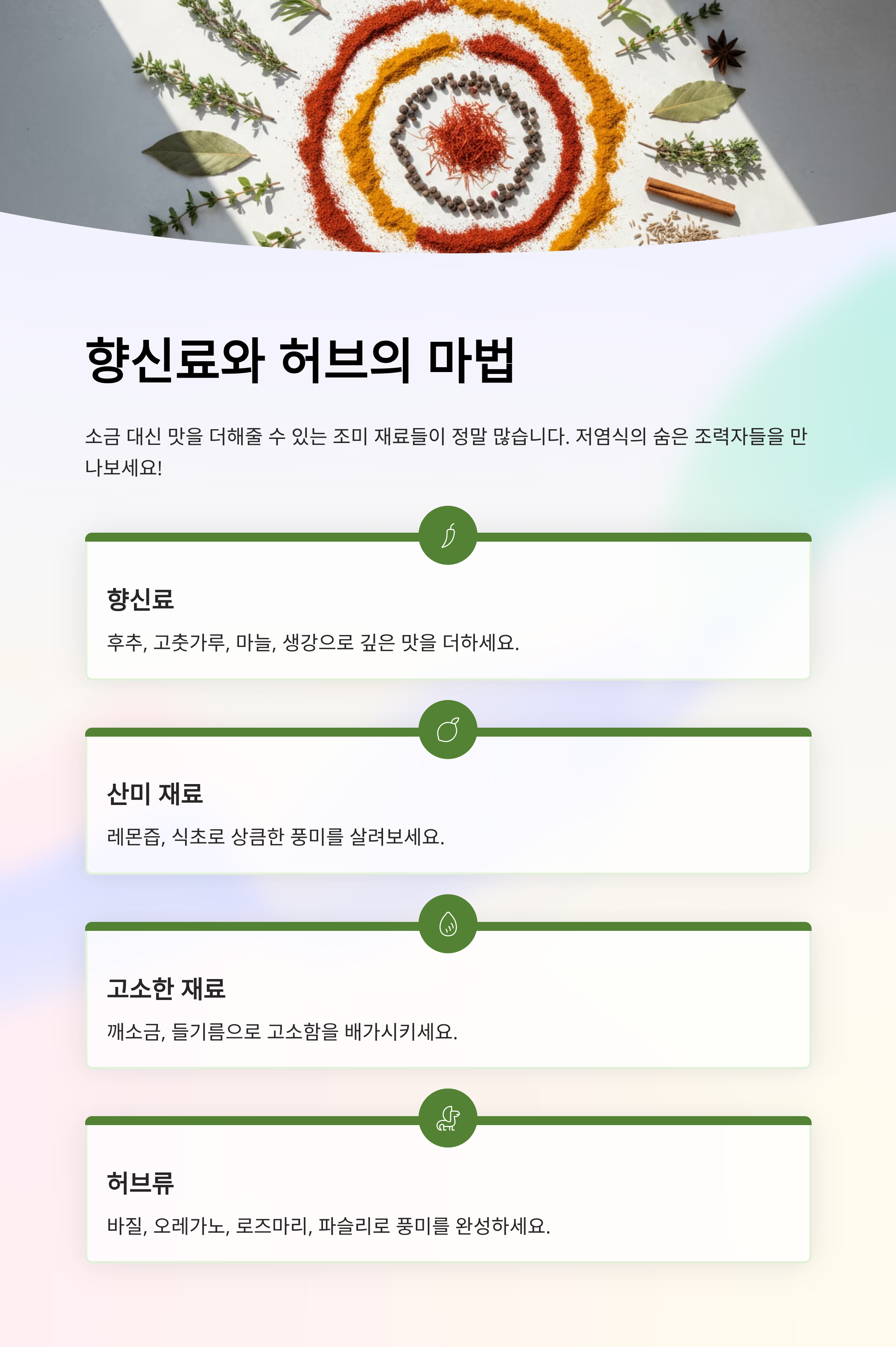 소금 대신 맛을 채우는 도구는 다양합니다: 후추, 고춧가루, 마늘, 생강, 레몬즙, 식초, 깨, 참기름·들기름, 머스터드, 미소(소량) 등. 허브는 특히 저염식의 핵심! 바질, 오레가노, 로즈마리, 타임, 파슬리는 소금 없이도 향을 배가시킵니다.