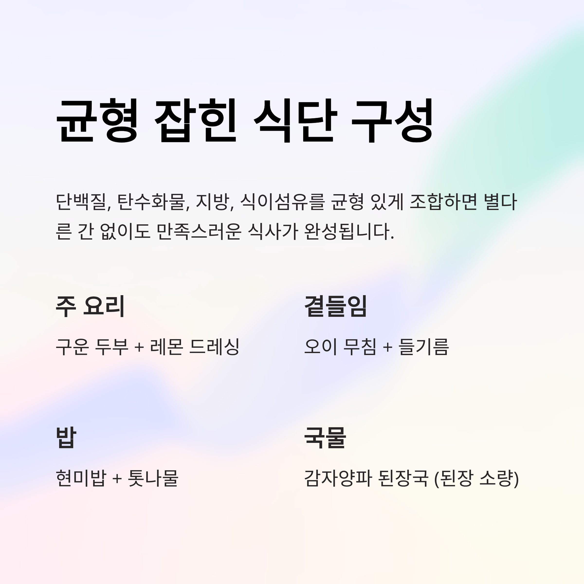 단백질·탄수화물·지방·식이섬유를 균형 있게 담으면 간을 세지 않아도 포만감과 풍미가 살아납니다.