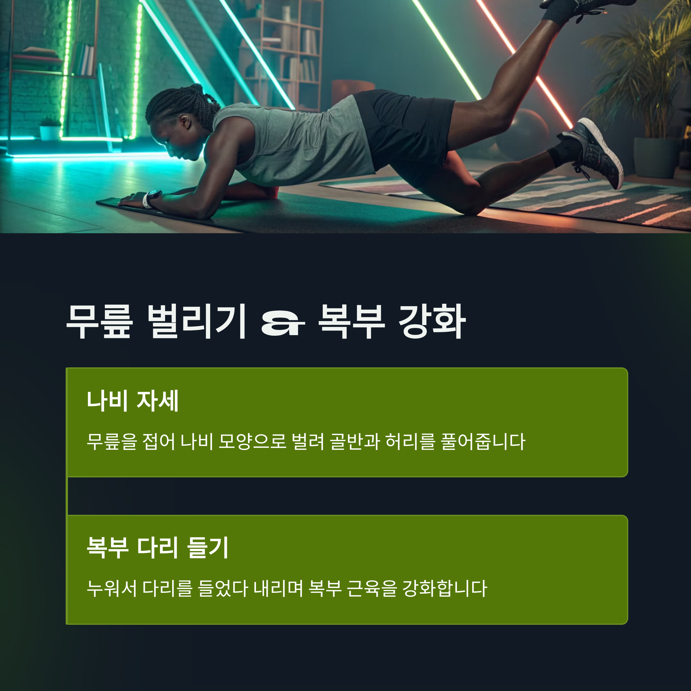 | 고양이-소 자세 | 1분 반복 | 쉬움 |