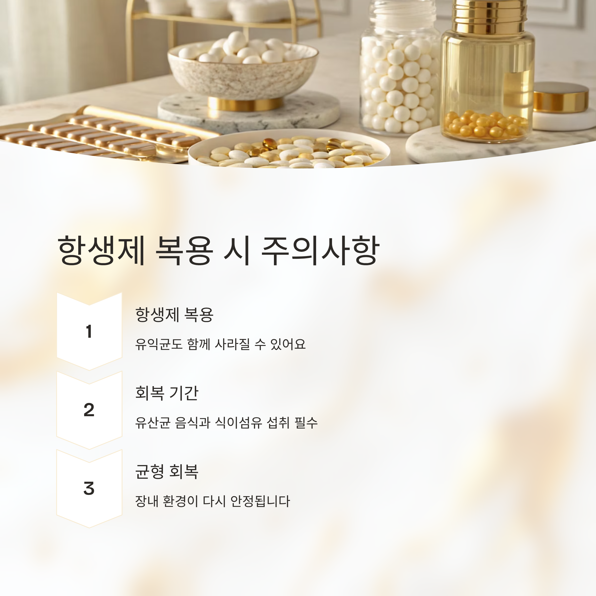 항생제는 감염 치료에 도움을 주지만, 동시에 유익균도 함께 제거할 수 있습니다. 따라서 복용 후에는 유산균이 풍부한 식품을 섭취하거나 식이섬유 섭취를 늘려 장내 균형 회복을 도와야 합니다.