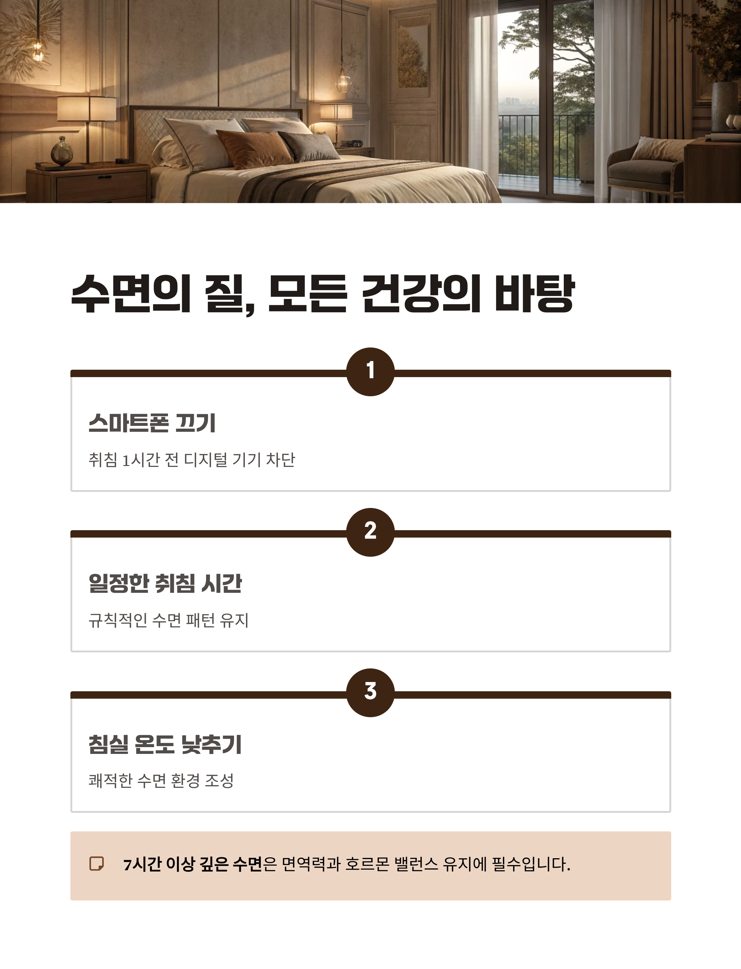 수면은 회복의 시간입니다. 스마트폰을 잠들기 1시간 전 꺼두고, 일정한 수면 리듬을 유지해보세요. 7시간 이상의 숙면은 면역력 강화와 호르몬 밸런스 유지에 필수입니다. 침실 온도는 18~20도로 유지하는 것이 좋습니다.