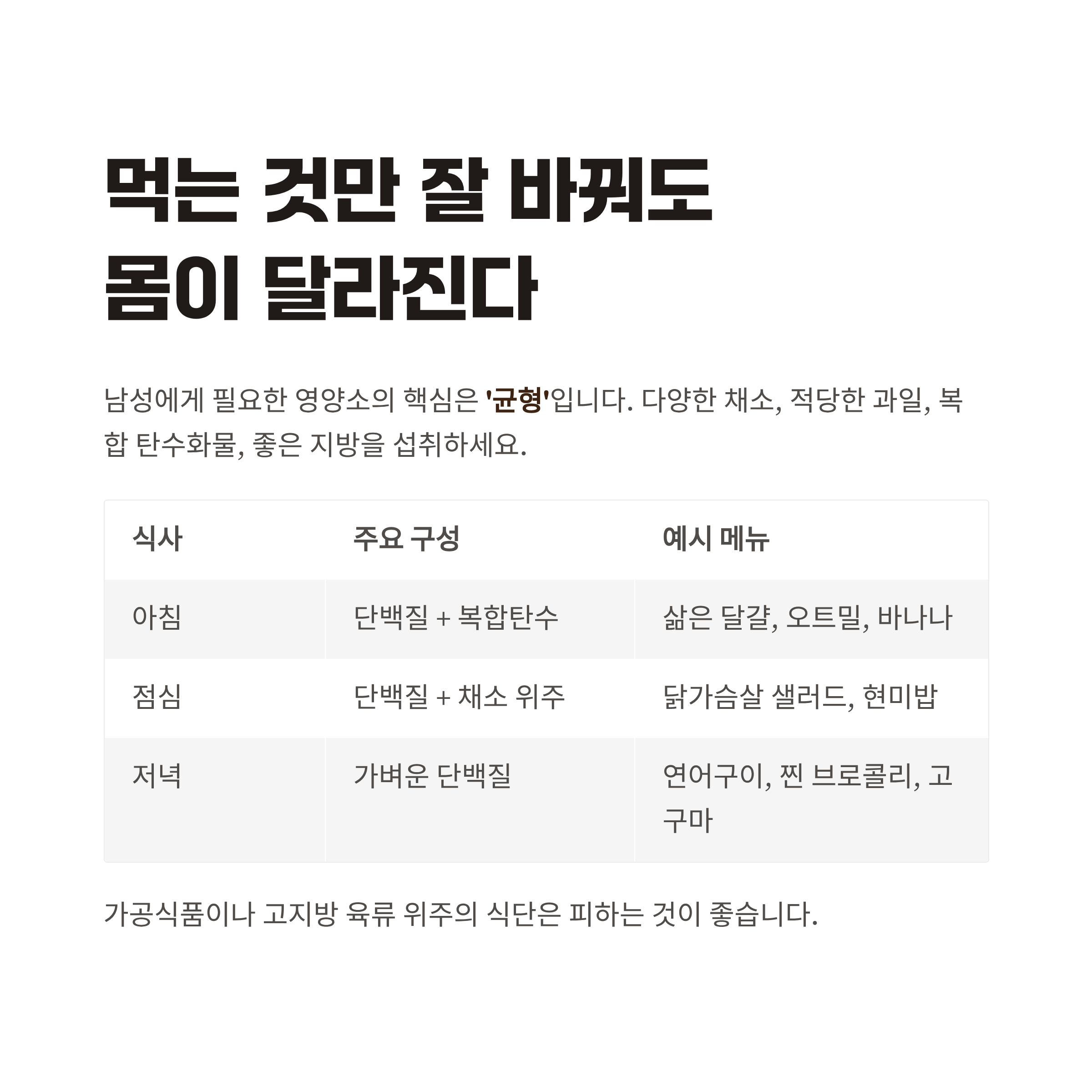| 아침 | 단백질 + 복합탄수 | 삶은 달걀, 오트밀, 바나나 |