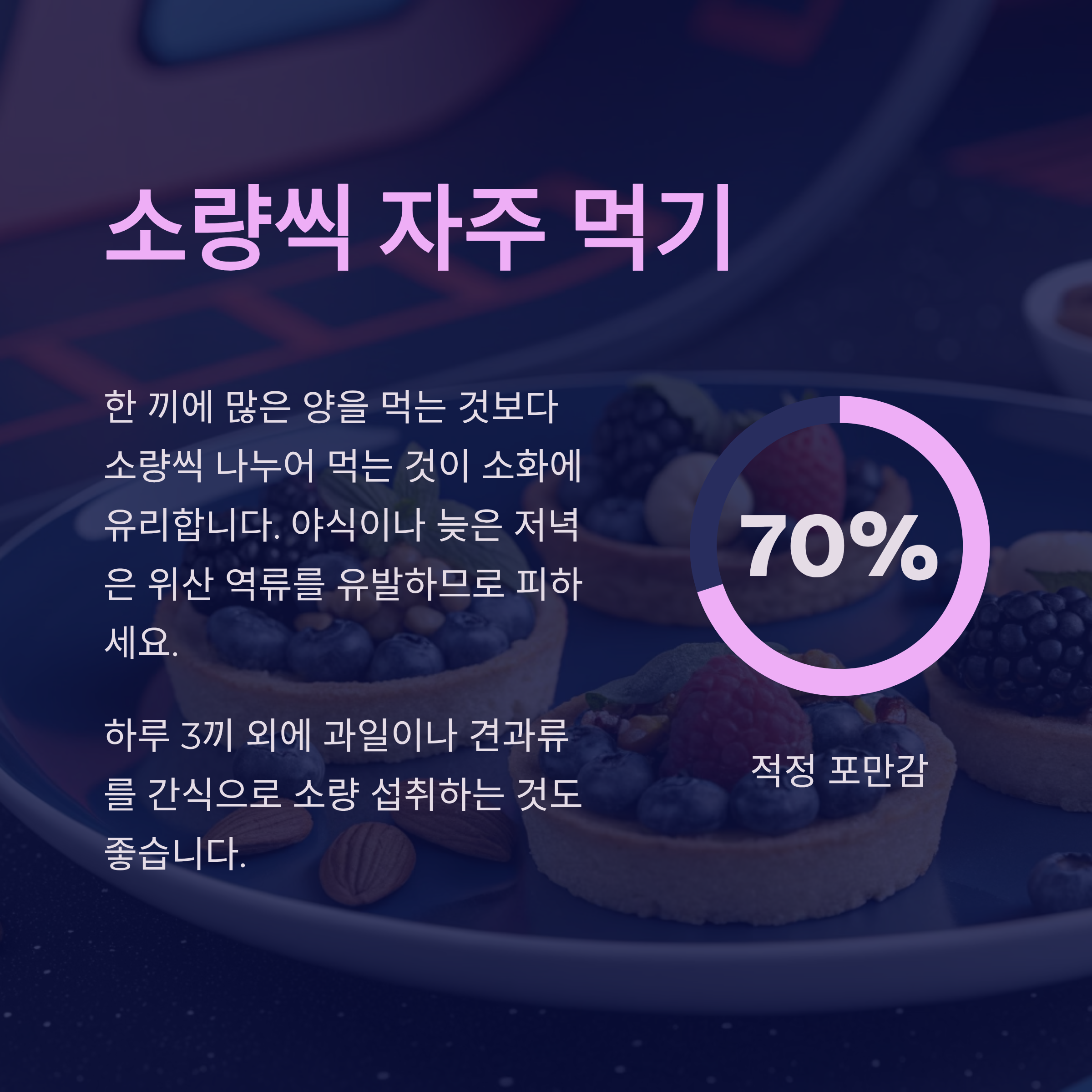 특히 야식이나 늦은 저녁은 위산 역류를 유발할 수 있으므로 피하는 게 좋아요.